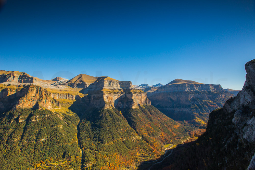 Madrugo para aprovechar al máximo la mañana. Subo a los llanos de Lalarri para poder contemplar el valle de Pineta, que está espectacular. Salida de sol con todo el valle vestido de otoño, un auténtico espectáculo. Por la tarde hago un pequeño trekking para poder ver y fotografiar las gargantas de Escuaín.