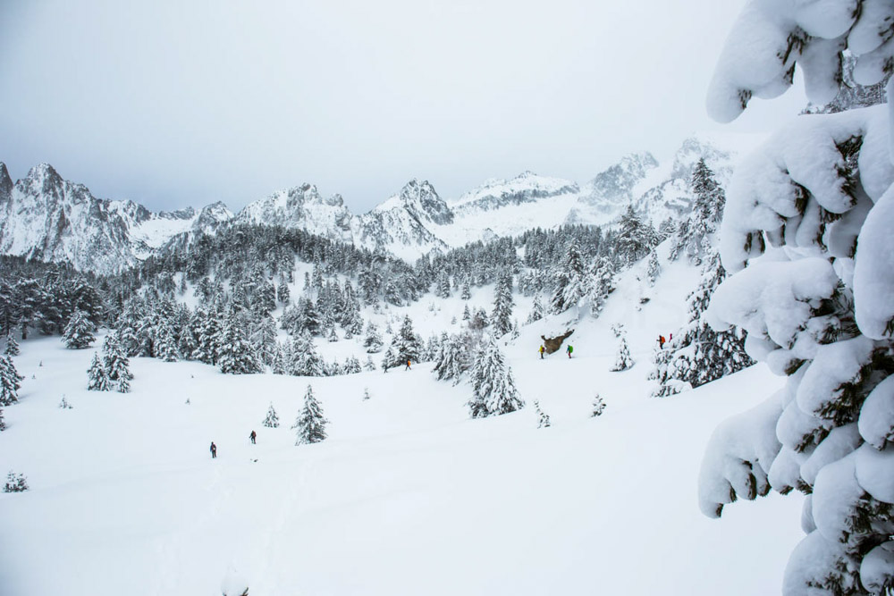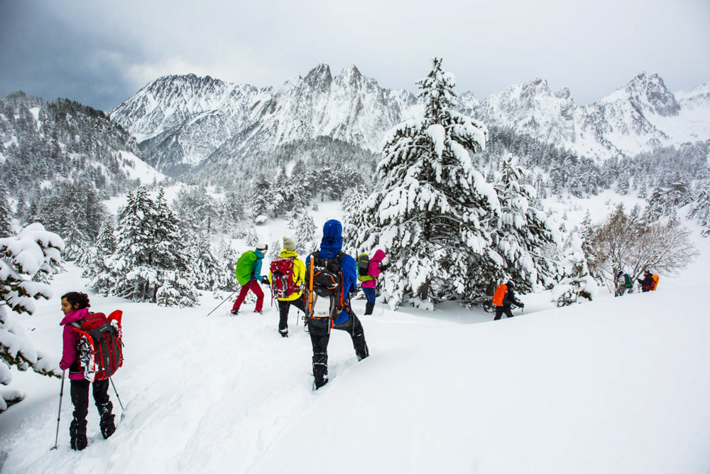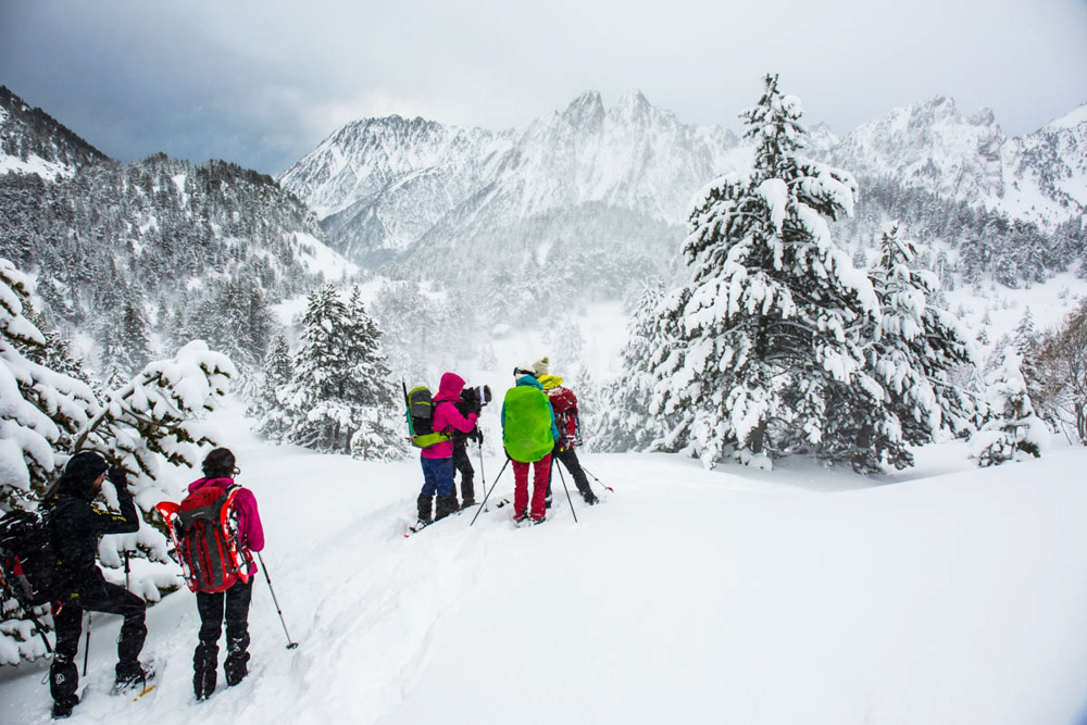 Así que empezamos a bajar los que vamos con raquetas de nieve, y el paisaje… es simplemente maravilloso. Es realmente espectacular.