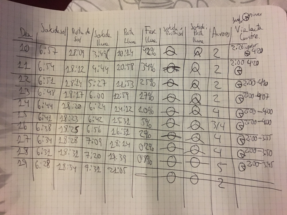 Ahora la comida. Es muy importante llevar la comida necesaria y de sobra. Con el frío extremo y el ejercicio físico, la quema de calorías es impresionante y es vital ir bien alimentado. En ese momento, tenía intolerancias alimentarias y encontrar comida deshidratada o con muchas calorías para el viaje era difícil. Por suerte, la comida vegana me iba bien, y fui a muchas tiendas especializadas para conseguir la comida adecuada. Preparé una lista de salidas y puestas de sol y luna, así como la actividad solar (para ver las auroras boreales). Habría actividad solar a mediados de semana, podremos verlas si la meteorología lo permite.
