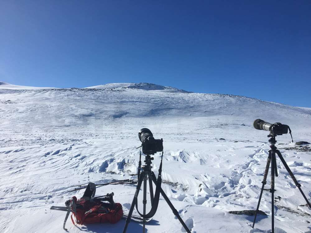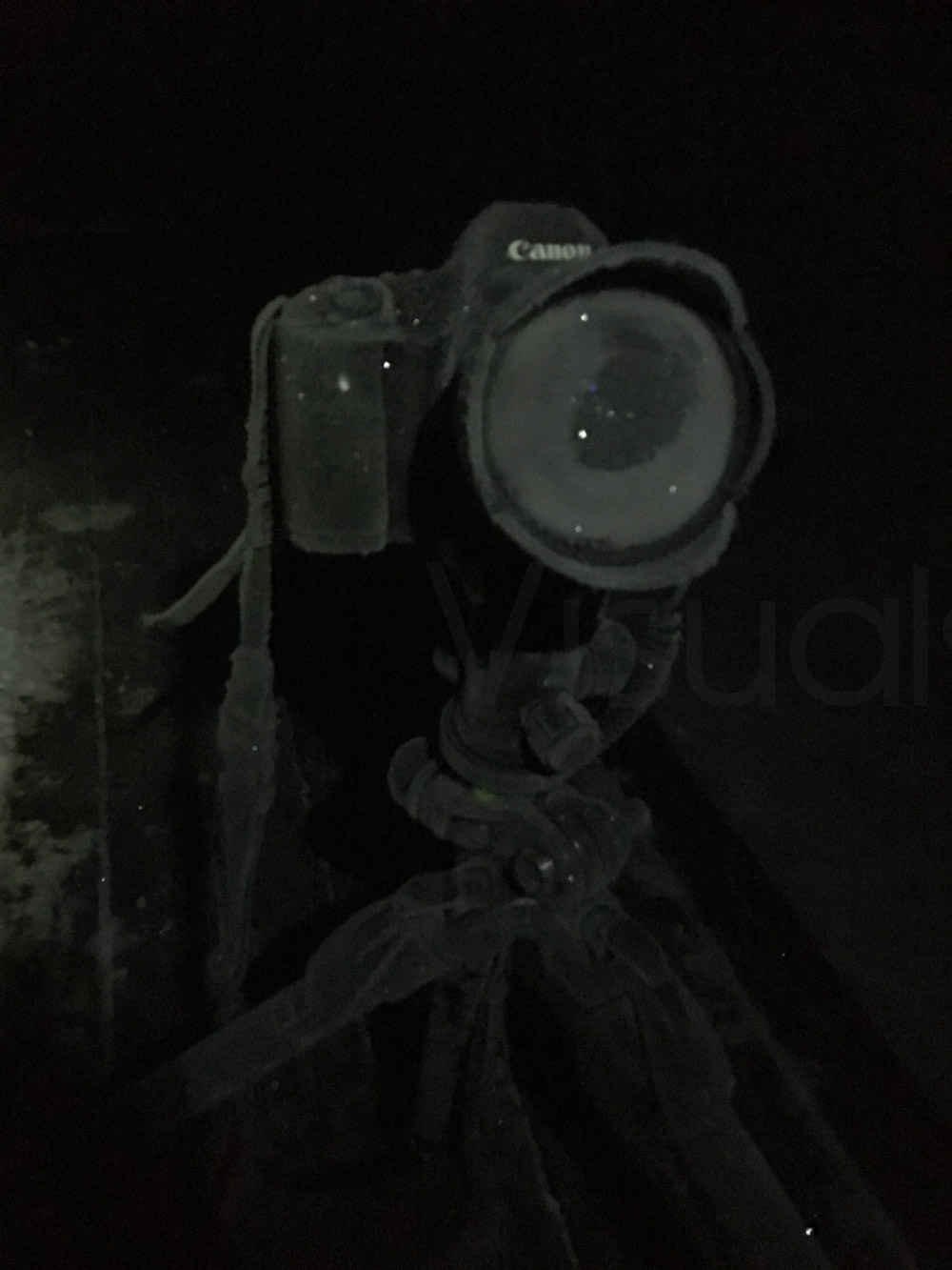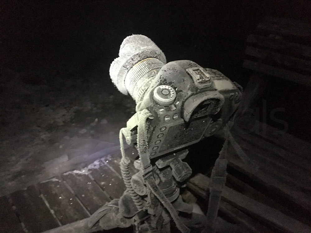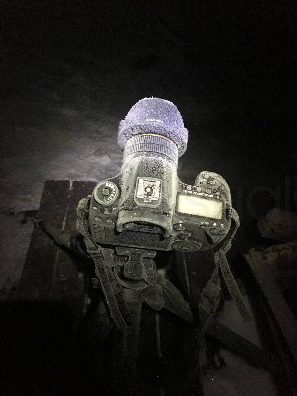 Me despierto a las 5h; el termómetro del refugio exterior marca -20 grados y voy a buscar la cámara. La encuentro totalmente congelada, cubierta por una buena capa de hielo. Cambio la batería y la cámara funciona correctamente. Es importante llevar un buen equipo fotográfico para estos climas extremos. Échale un vistazo a mi equipo fotográfico pinchando aquí.