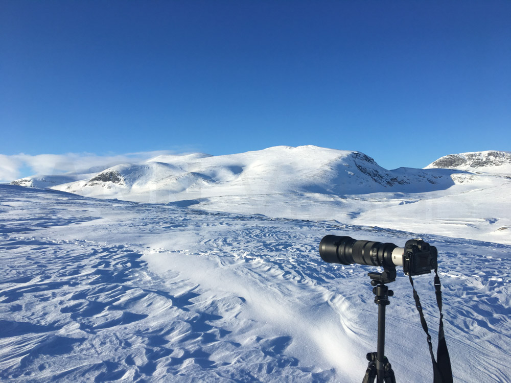 Así que realizamos una excursión con esquís y sin pulka hasta el siguiente puerto para contemplar las vistas de la otra zona del parque nacional. Subimos hacia el puerto cómodamente siguiendo las huellas pisadas con moto de nieve. Al llegar arriba, ¡qué vistas! Ha valido la pena subir hasta aquí. Descendemos de nuevo al refugio para comer y luego damos un paseo por los alrededores para fotografiar la puesta de sol.