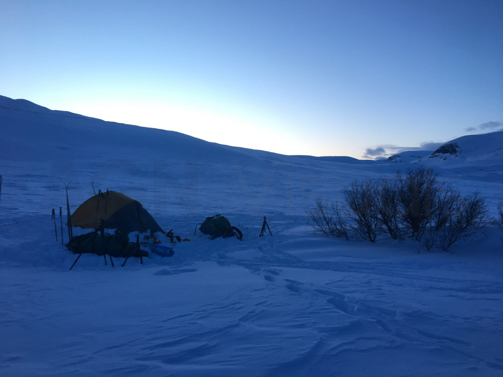 Preparamos la cena y, de repente, sorpresa: un grupo de bueyes empieza a bajar desde las colinas encima nuestro, hacia el fondo del valle. Lo hacen en el horizonte, con las montañas nevadas e iluminadas por los últimos rayos de sol de fondo. Fue un momento realmente emocionante. Las fotos no hacen justicia (debido a la Fata Morgana) a ese momento vivido. Lo que también estábamos notando era un frío extremo. En la travesía del Lago Inari en Finlandia, viví el frío de los -30 grados, pero el frío que estaba sintiendo en la cara en ese momento no lo había vivido nunca. Días después en casa, encontré los registros de una estación meteorológica cercana; esa noche llegamos a los -36,3 grados bajo cero. Ya decía que eso no lo había vivido antes.