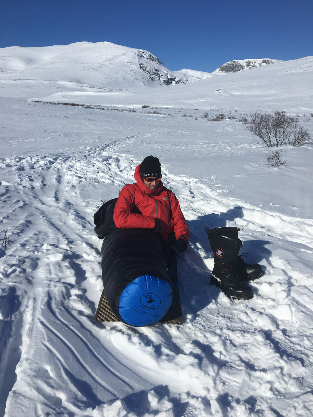 Desayunamos, derretimos nieve, la hervimos, preparamos los termos, ajustamos las pulkas y seguimos la ruta por el camino del segundo día. Esta noche pasada será la última que dormimos cómodamente en el refugio y colchones; las próximas noches tendremos que dormir en tienda, esterilla y saco de dormir.