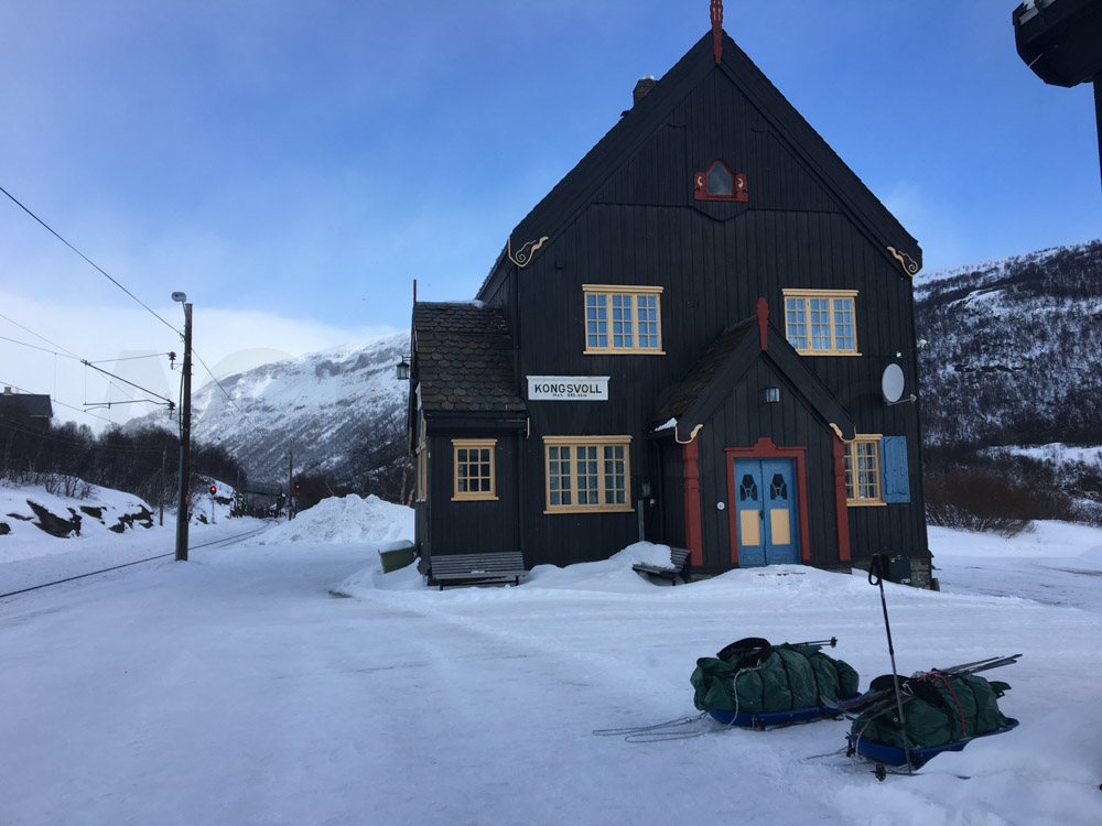 Llega el día de la verdad, hoy empieza la expedición con esquís sobre el terreno. No había billetes de tren más temprano, y el que había nos deja en Kongsvoll (cerca del inicio de la travesía) hacia el mediodía. Entre la estación de tren y el punto de inicio de la expedición, hay cerca de 1 kilómetro de distancia que habrá que hacer por el arcén de la carretera. Por suerte, en esta época del año hay bastante nieve y hielo en el arcén, y podemos arrastrar la pulka por aquí. Si no hubiera nieve, hubiéramos tenido que llevar las pulkas a pulso.