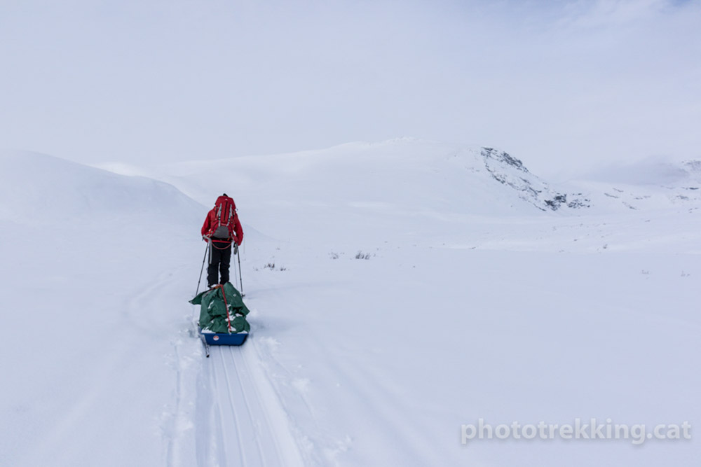 Después de una segunda noche en el refugio, tenemos ganas de hacer una excursión más larga. La intención inicial del viaje era cruzar más kilómetros del parque y fotografiar los bueyes, pero al ver cómo estaba el terreno, nuestras capacidades y el peso de la pulka, y al darnos cuenta de que los bueyes los habíamos dejado atrás, decidimos no seguir más adelante y quedarnos en ese valle. La principal razón del viaje eran los bueyes, y no tenía sentido hacer más kilómetros sin verlos más.