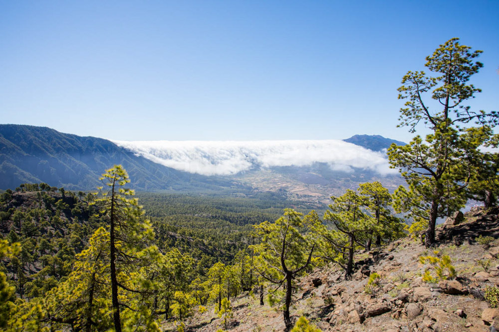 Además, los vientos alisios provocan que haya muchas nubes bajas que atraviesan la isla. Entonces, cuando chocan con las montañas de la Caldera de Taburiente, no pasan, pero en una zona más baja, entre esta y el Birigoyo, es donde se forma una cascada de nubes. Es una pasada.