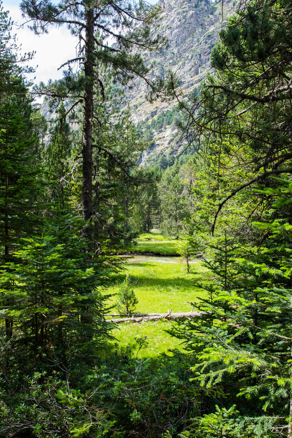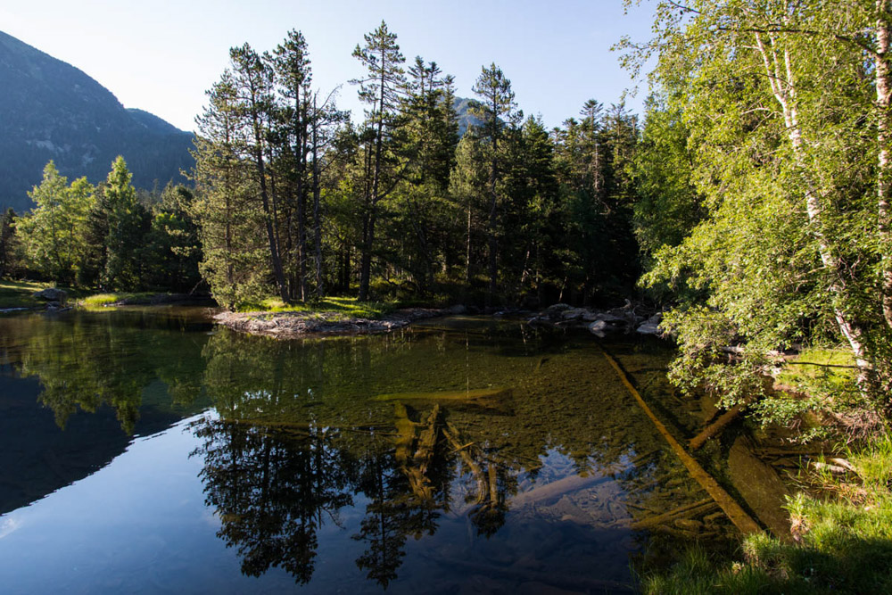 Hoy comenzamos una excursión por una de las vertientes del Valle de Boí, justo por la parte que da el segundo nombre al parque: Aigüestortes. Es una zona realmente preciosa, con un río serpenteante que atraviesa un valle muy plano, rodeado por bosques de pino negro.