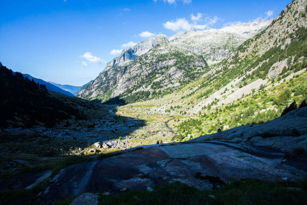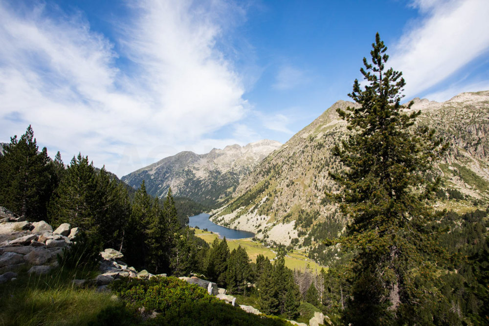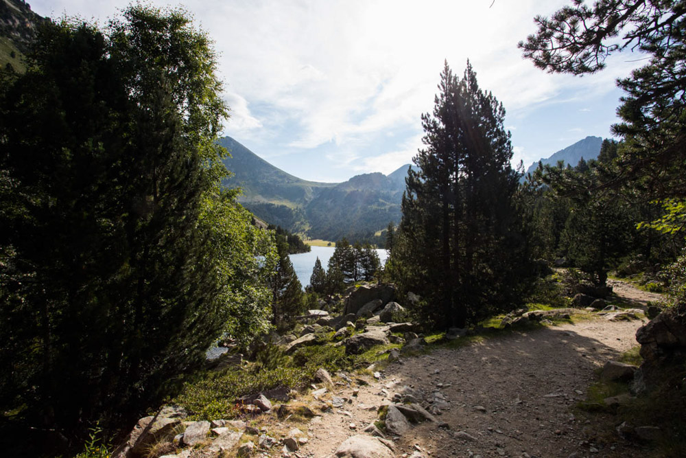 Comemos allí y bajamos por el Estany Llong, un lago rodeado de paredes de montaña impresionantes. A medida que descendemos, seguimos disfrutando del entorno, siempre con el Estany Llong al fondo del paisaje.