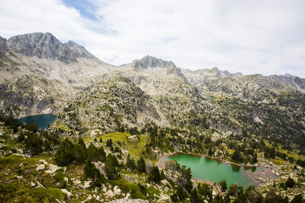 Desde el Portarró de Espot bajamos un poco y nos desviamos a la izquierda hacia un mirador desde donde se ven los lagos de la Bassa de les Granotes y el Estany Negre. Es una vista espectacular, ya que son dos lagos muy distintos entre sí, incluso en el color del agua.