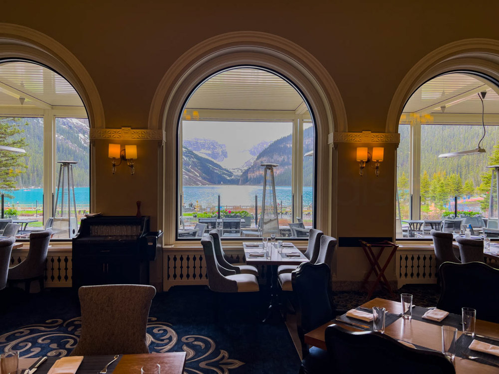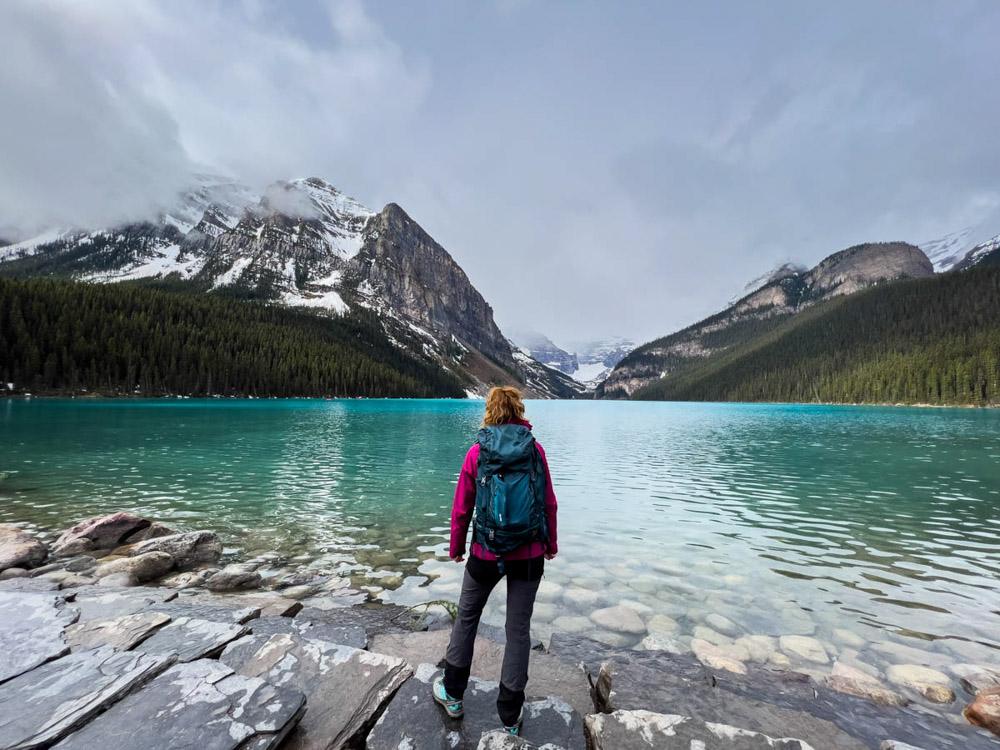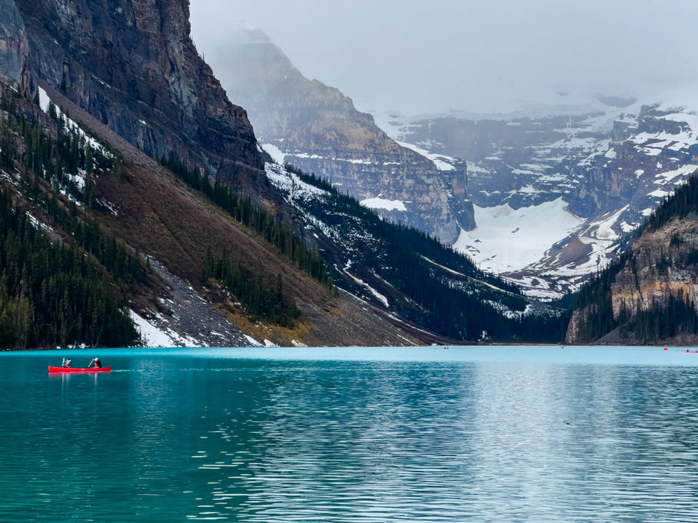 Nos levantamos bien prontito (el jet lag ayudaba) y nos fuimos directos a visitar otro lugar espectacular: el Lake Louise, en el Parque Nacional de Banff. Aunque el día estaba algo nublado, con momentos de lluvia, estos contrastes típicos de la primavera también le daban su encanto al paisaje.