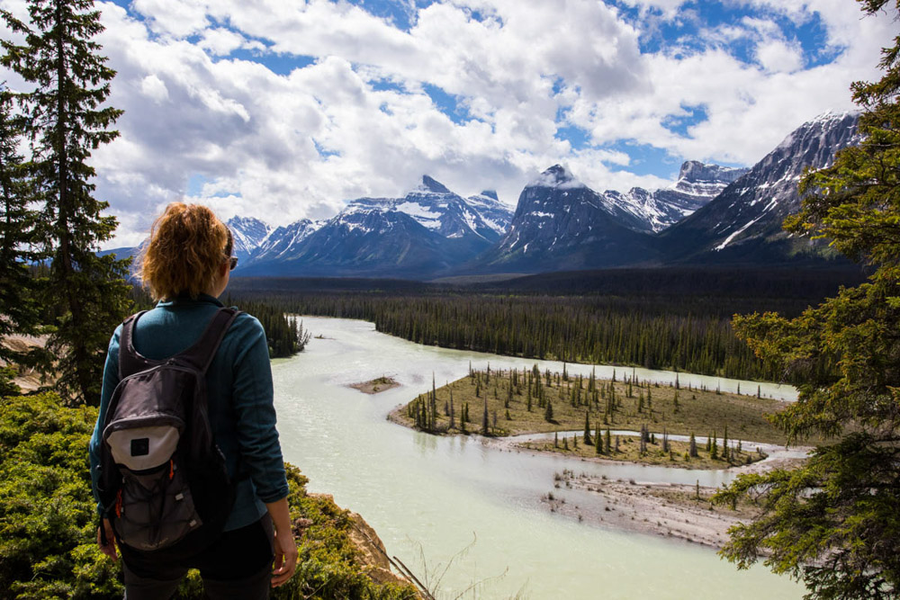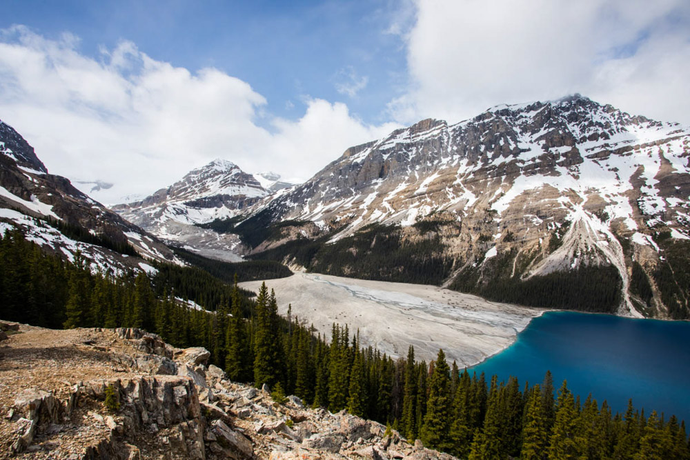 Después, seguimos nuestra ruta hacia el Lake Peyto. En este lago hay un mirador principal desde donde se obtiene una vista espectacular, aunque el camino hasta allí da un poco de respeto: uno se puede encontrar con un oso de repente, y eso a mi mujer le daba bastante miedo. Pero más adelante hay otros miradores todavía más impresionantes, aunque hay que caminar bastante más.
