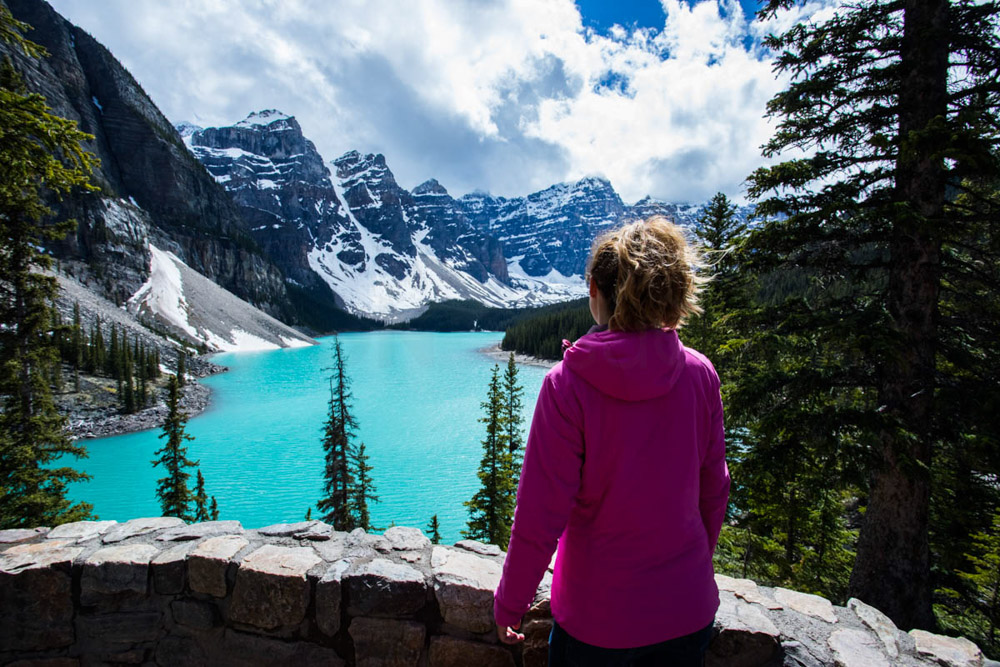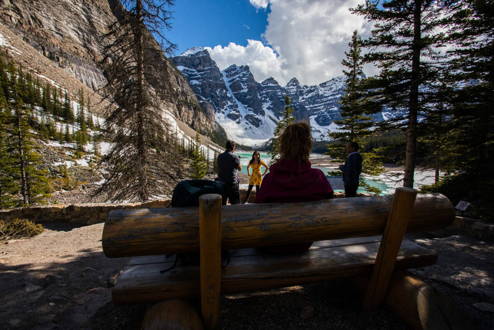 Esto nos permitió hacer algo que nos había quedado pendiente al principio del viaje: visitar el Lago Moraine. Cuando llegamos a Canadá, este lugar estaba cerrado por la nieve, después se pudo visitar con el lago bastante vacío y con nieve, pero ahora, después de varios días de sol y temperaturas más suaves, por fin estaba accesible y lleno.