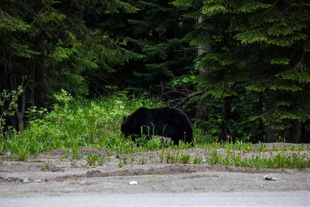 Y así fue: me fuí solo a recorrer algunos parques cercanos, cámara en mano, con la esperanza de ver algún oso. Caminó por distintos senderos, miradores y zonas menos transitadas, pero no tuve suerte. Justo cuando ya estaba de regreso, y casi tocando la entrada del Glacier National Park, ¡sorpresa! Apareció un precioso oso negro al lado de la carretera principal. No en un sendero escondido, sino allí, a plena vista. Pude fotografiarlo tranquilamente durante un buen rato. Una experiencia espectacular.