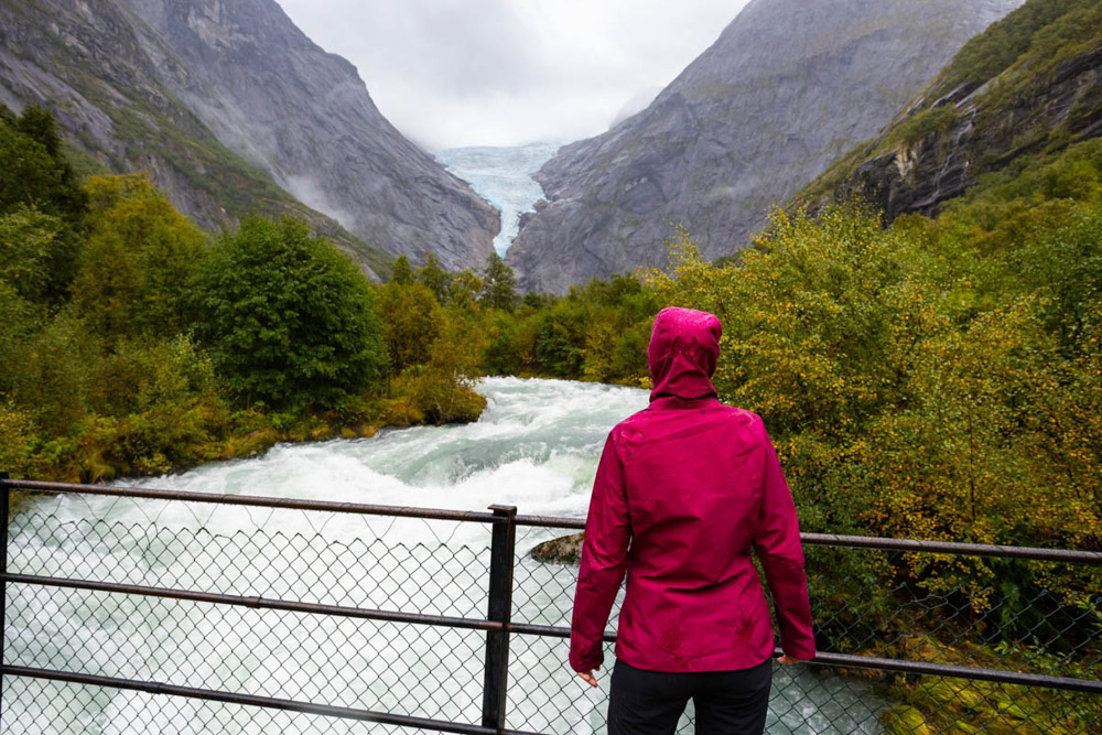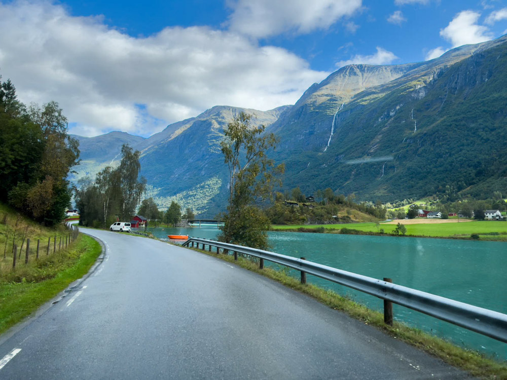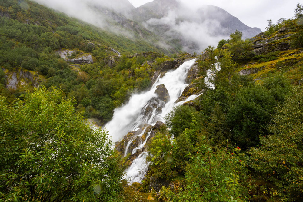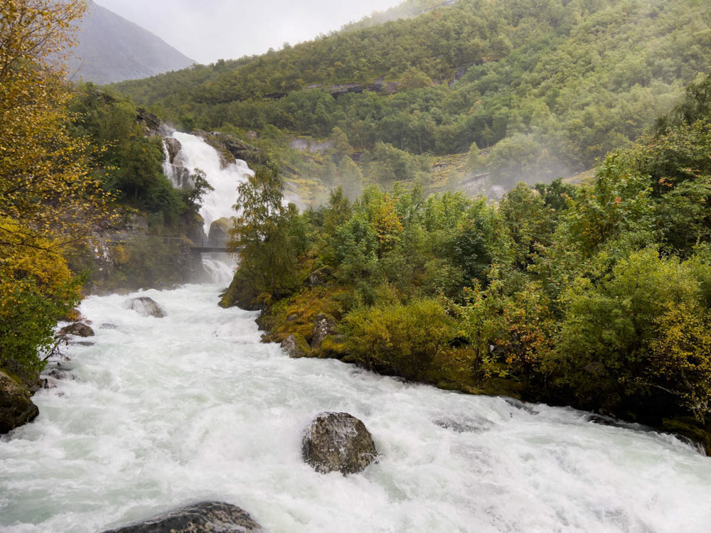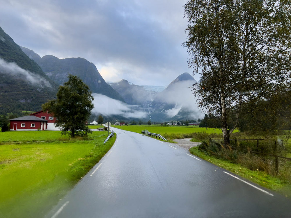 Hoy queremos llegar a la zona de la lengua glaciar de Briksdal, que forma parte del gran glaciar Jostedalsbreen. Nuestra idea era pasar la noche en un camping cercano, pero las lluvias han sido realmente torrenciales, muy intensas.
