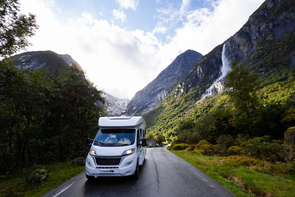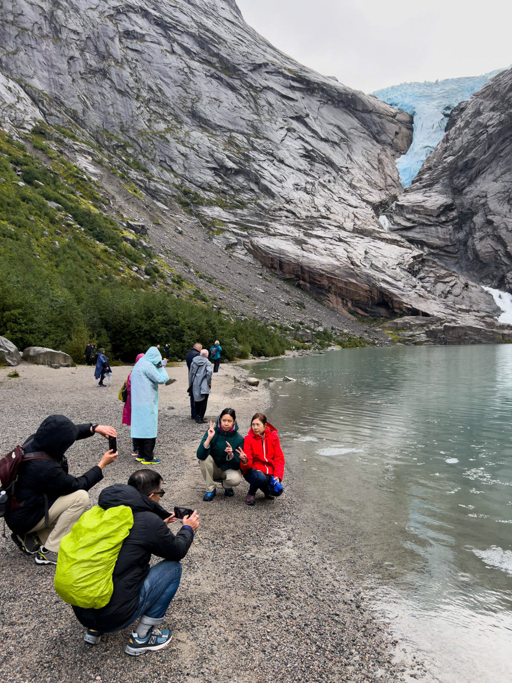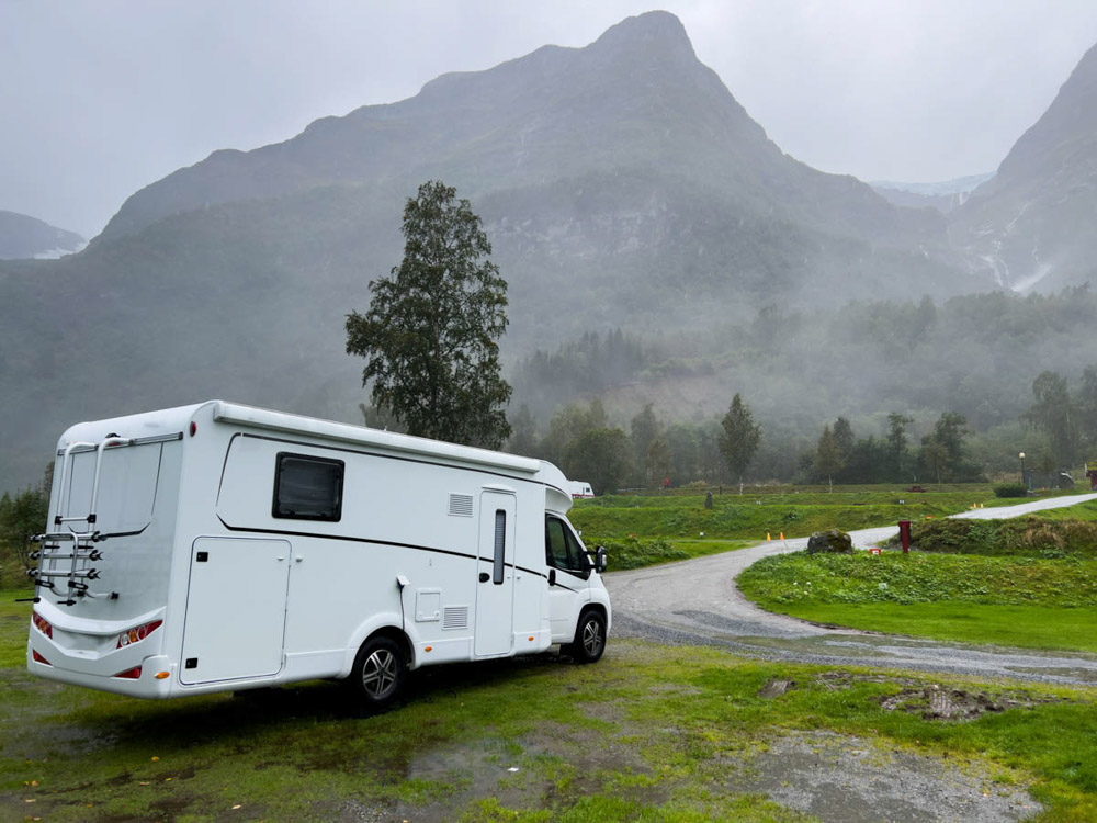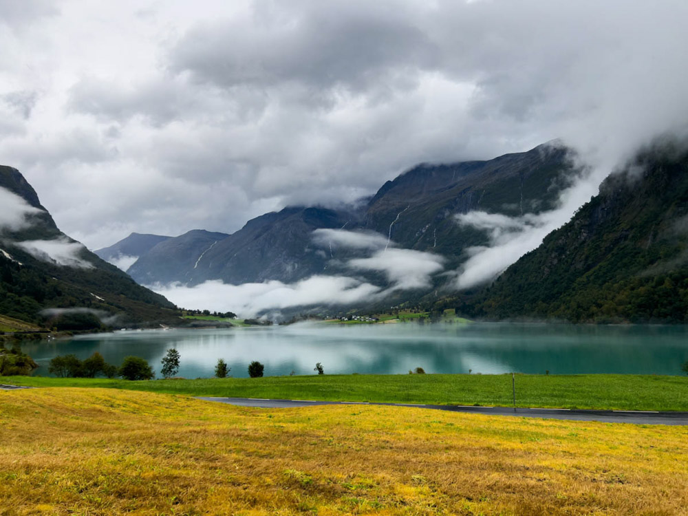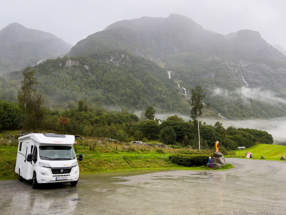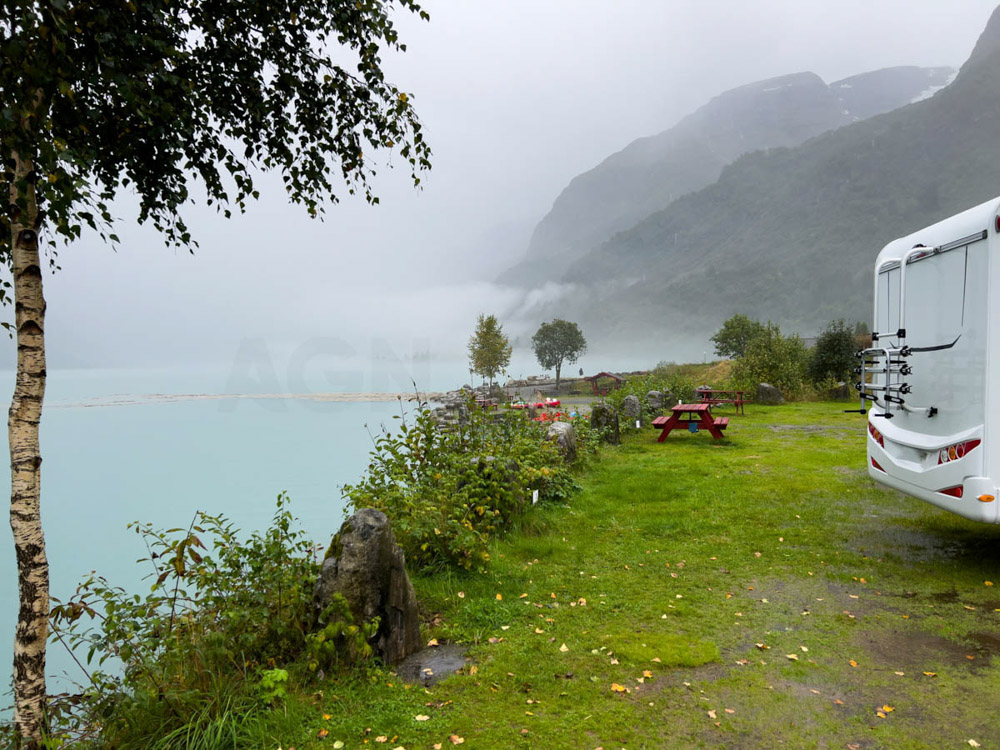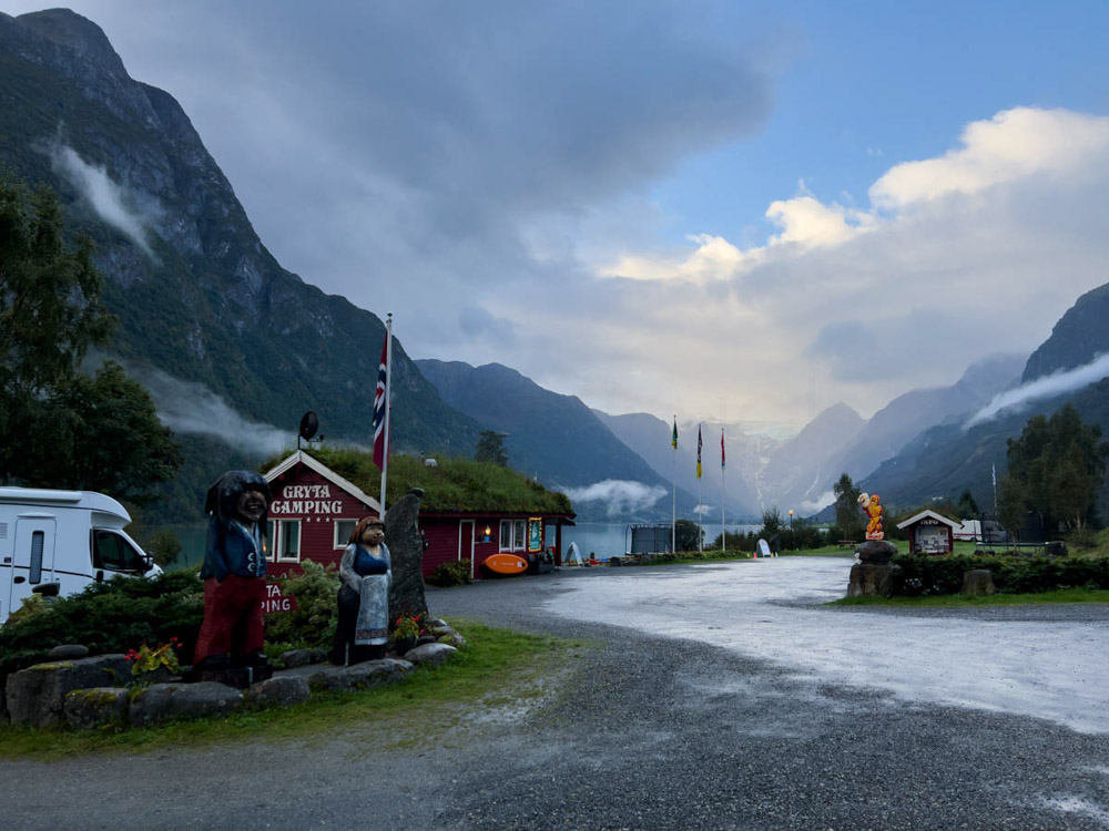 Amanece un día algo nublado, con algo de neblina, pero empiezan a abrirse algunos claros. Cogemos la autocaravana, vaciamos las aguas negras y grises en la zona habilitada del camping, y nos dirigimos hacia el glaciar de Briksdal. No hay señales ni presencia policial que indiquen lo contrario, así que entendemos que el acceso está abierto. Seguimos adelante, contemplando un paisaje realmente espectacular, y aparcamos la autocaravana en el parking principal para autocaravanas.