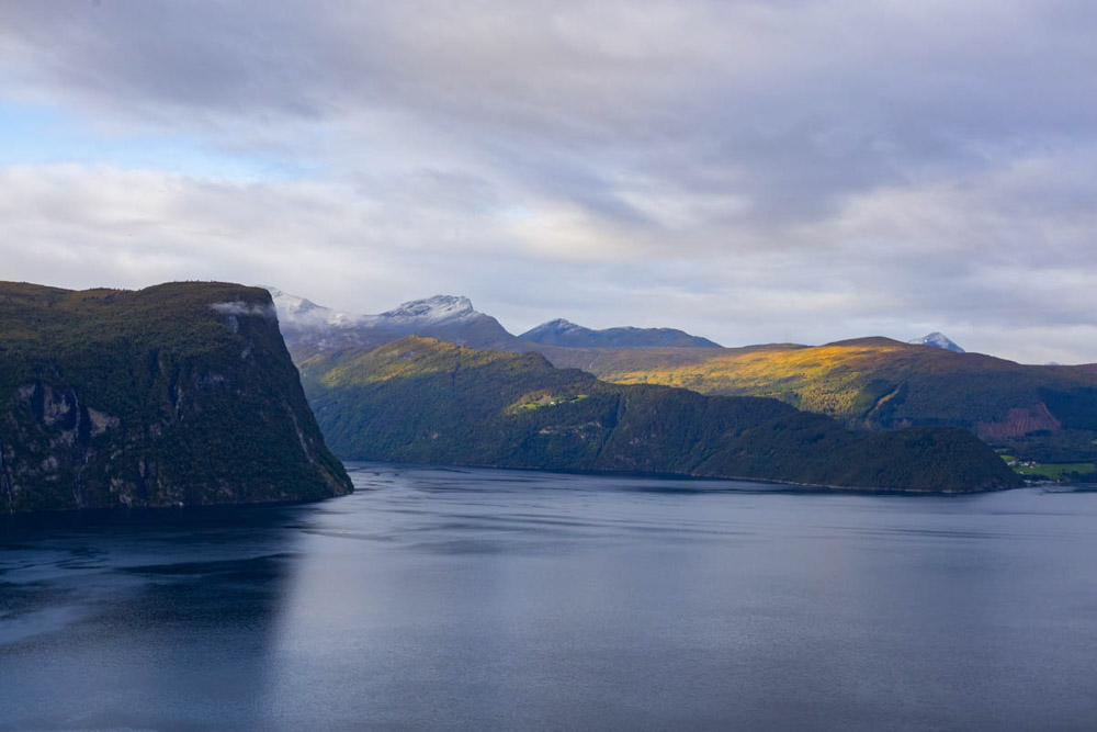 El mirador es espectacular: ofrece unas vistas increíbles del fiordo Aurlandsfjord. Luego comenzamos a bajar también por una carretera muy, muy estrecha.