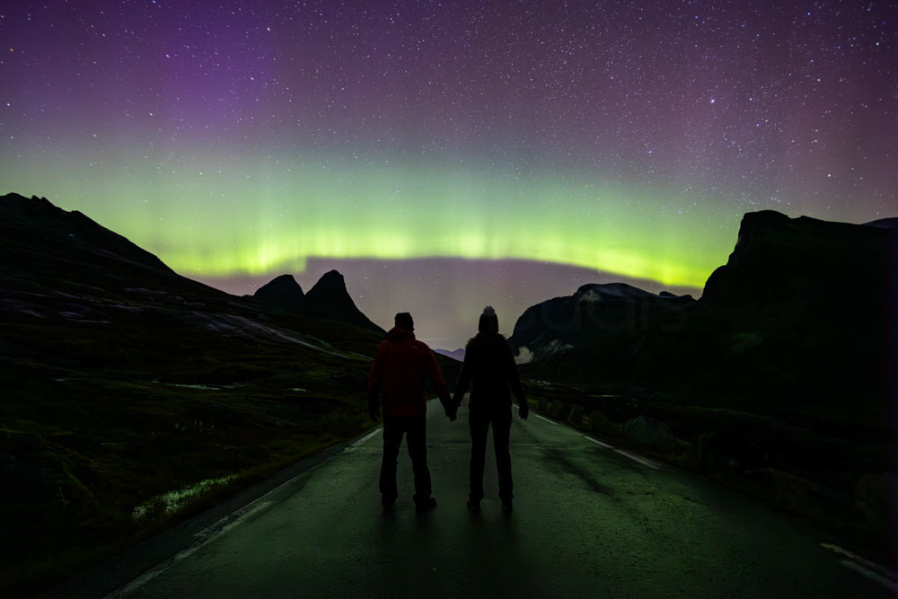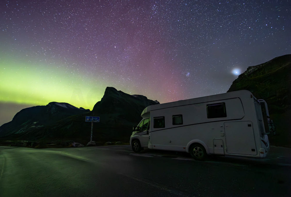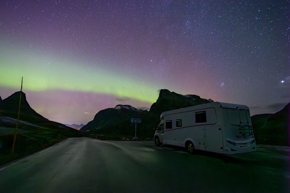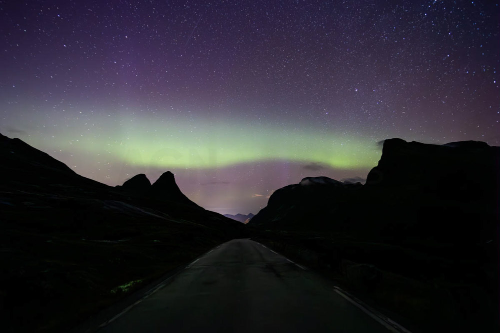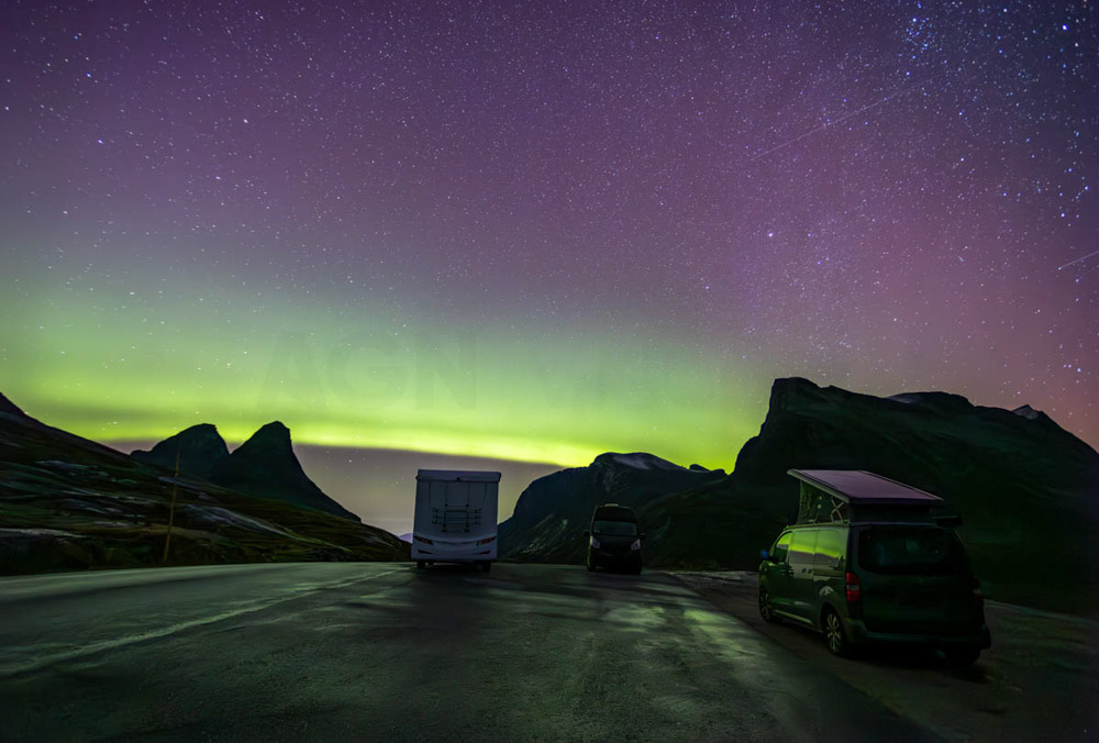 Volvemos a subir toda la carretera de los Trolls, porque mi idea era fotografiar las auroras boreales desde arriba, desde el puerto de Rauma. Hay un parking allí arriba en el que se está bastante a gusto.