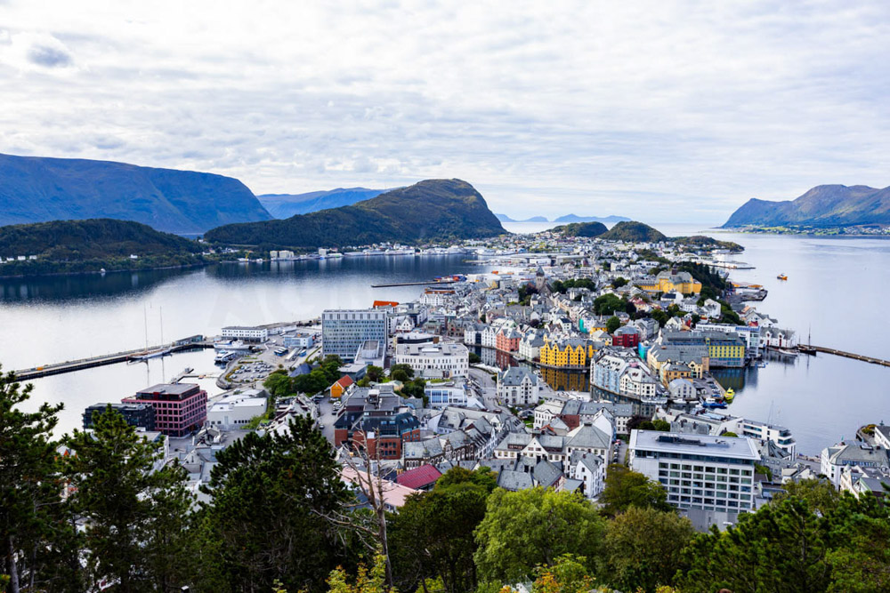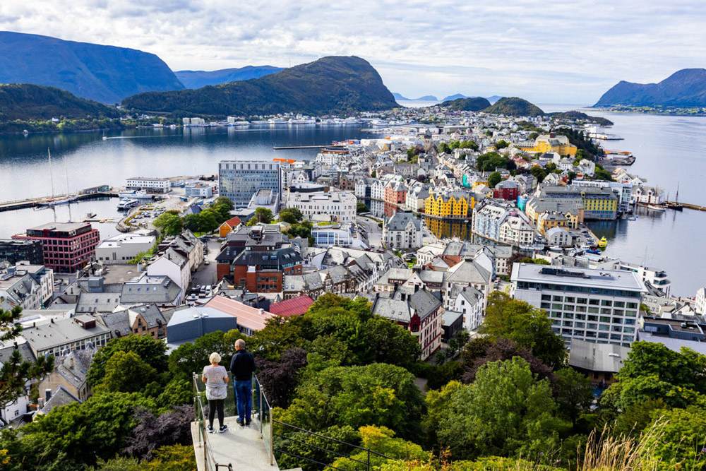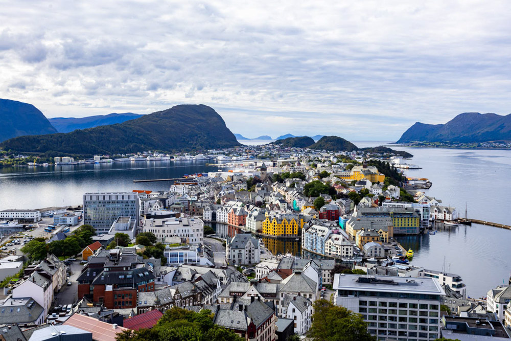Primero subimos al mirador de Ålesund, que realmente merece la pena. Las vistas desde arriba son espectaculares. Subimos andando —se puede subir en coche, pero en autocaravana diría que no es recomendable, aunque no estoy del todo seguro—. Aun así, hacerlo a pie desde la base del pueblo tiene su encanto, porque vas viendo diferentes perspectivas de este precioso lugar a medida que avanzas.