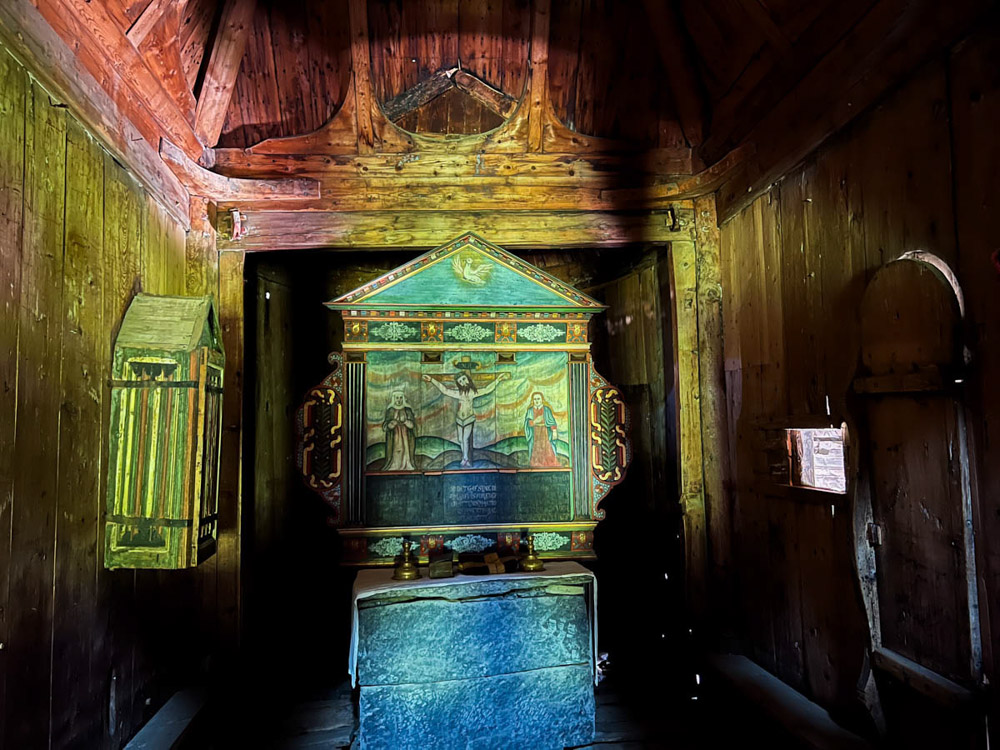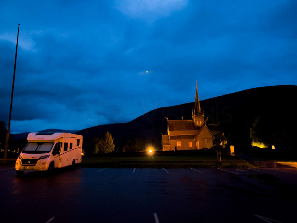 Aparcamos justo al lado de su espectacular iglesia de madera, un lugar realmente bonito. No hay ninguna señal que prohíba pernoctar, así que decidimos pasar la noche allí. Damos un paseo por el pueblo para disfrutar de la tarde y del encanto tranquilo de este rincón noruego.