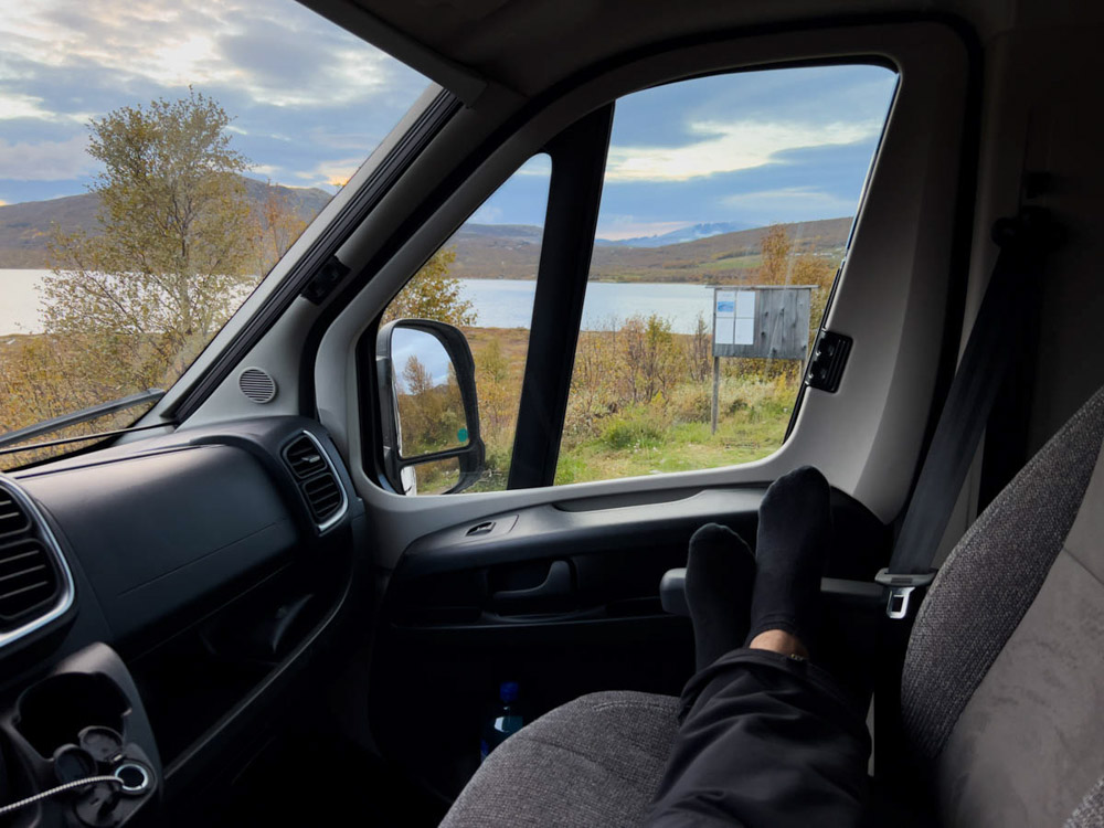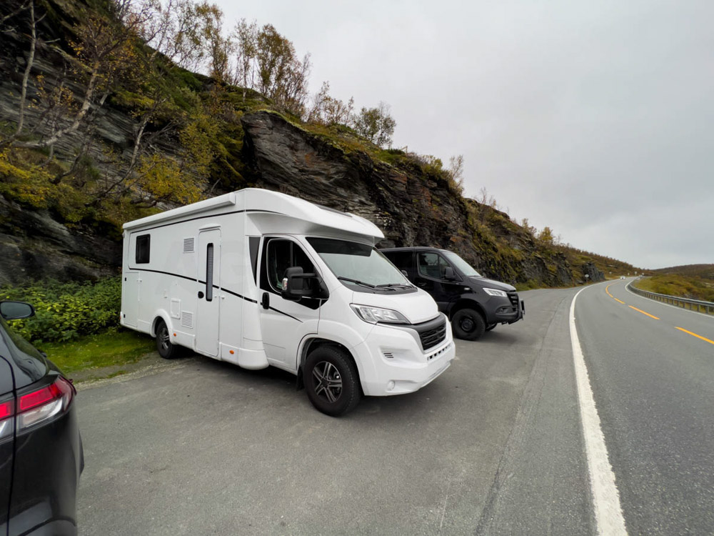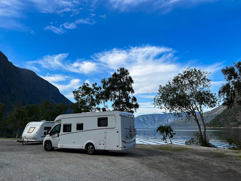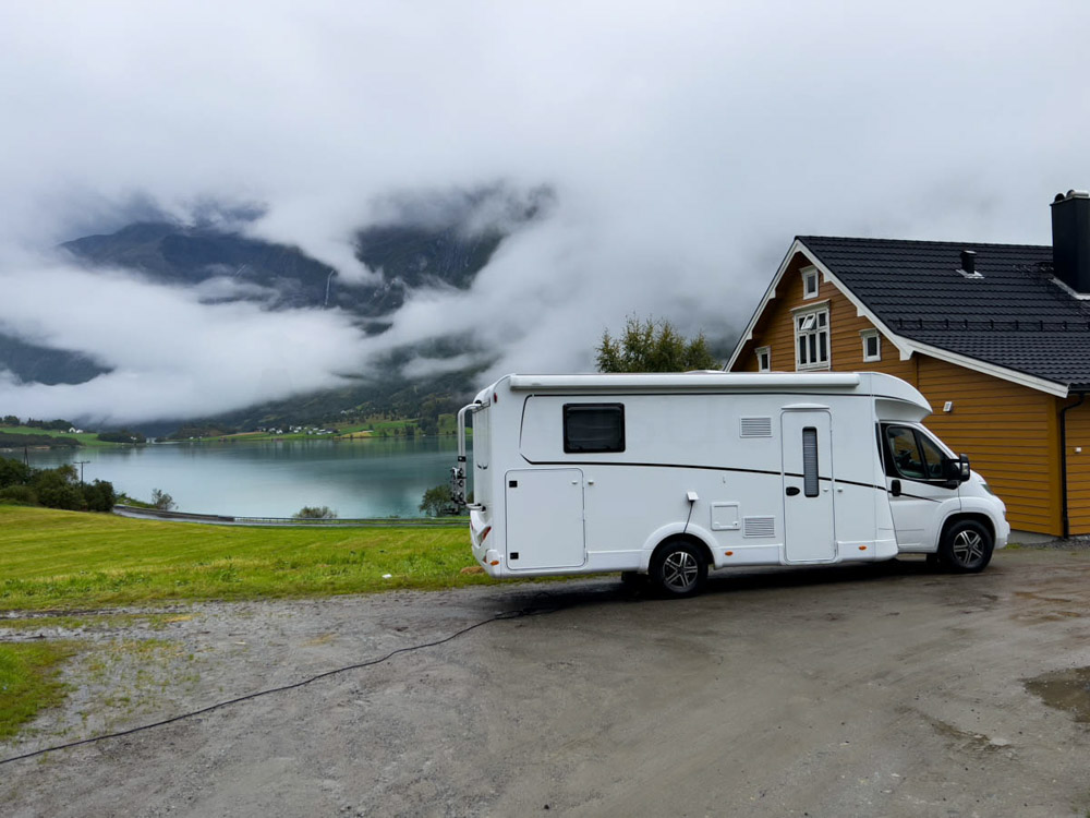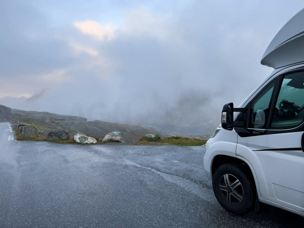 No queríamos arriesgarnos a cruzar el fiordo con ese viento. No tanto por miedo a volcar con la autocaravana, sino porque no queríamos quedarnos atrapados en tierra sin poder continuar la ruta. Los noruegos son muy prudentes y, ante cualquier peligro, cierran el paso.