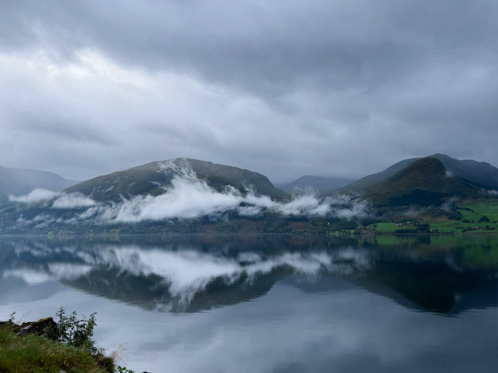 Como no llueve fuerte y todo está en calma, los fiordos y algunos lagos se ven como espejos, con unos reflejos impresionantes. Seguimos recorriendo el camino. En un momento nos encontramos con un poco del típico tráfico noruego: vacas en medio de la carretera.