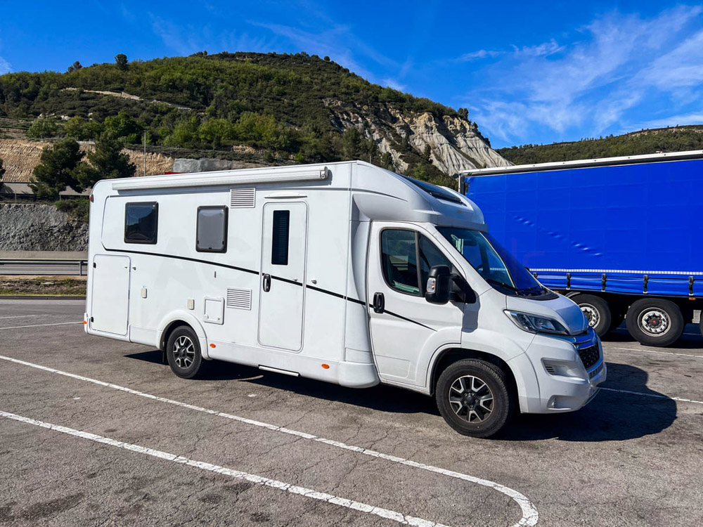 Como la autocaravana se recoge por la tarde, solo llegaremos hasta una área en el sur de Francia. Paramos en una de las áreas de la cadena francesa de autocaravanas Camping Car Park —está muy bien. Pasamos la noche allí y, al día siguiente… no, ¡stop!