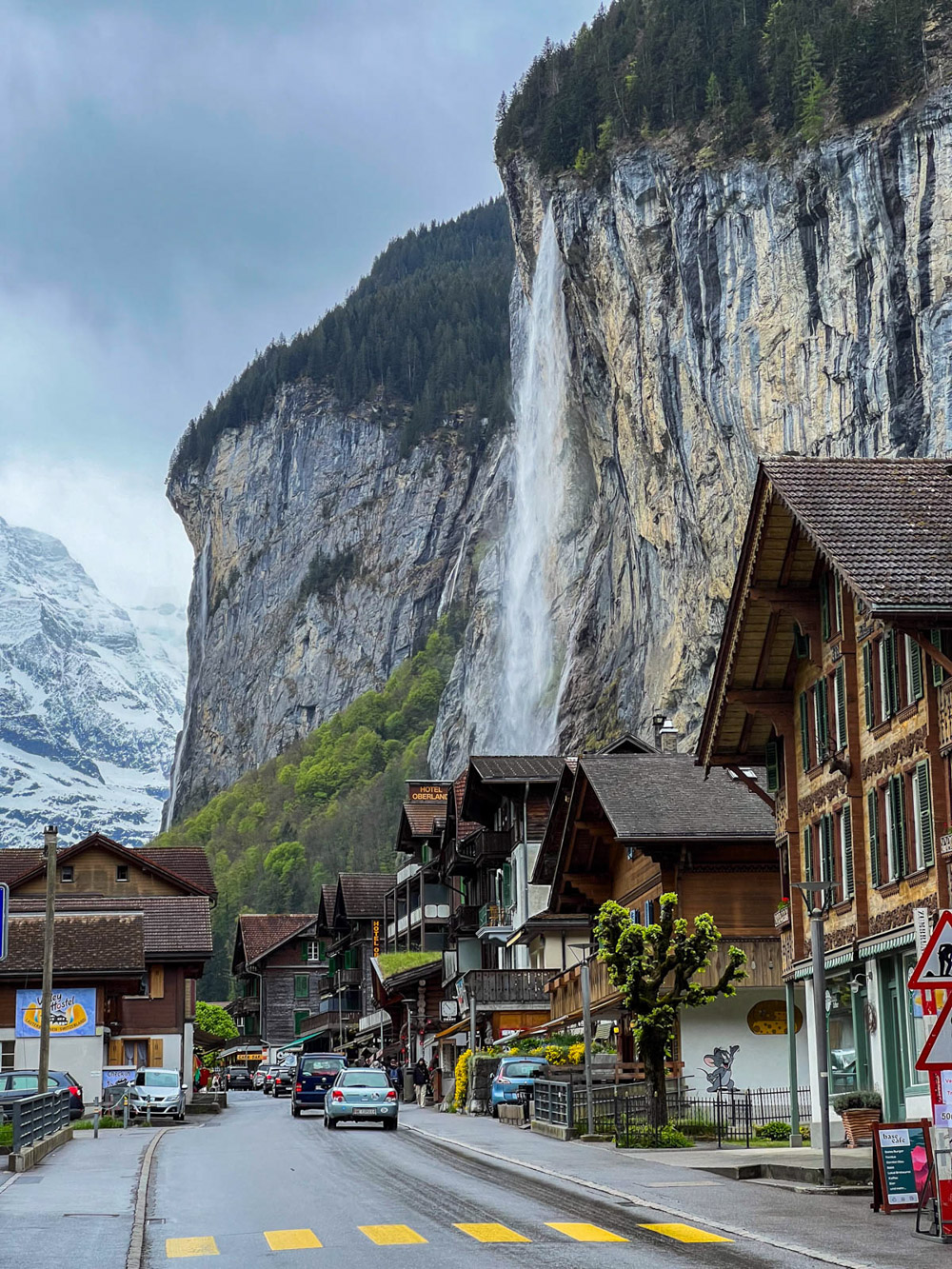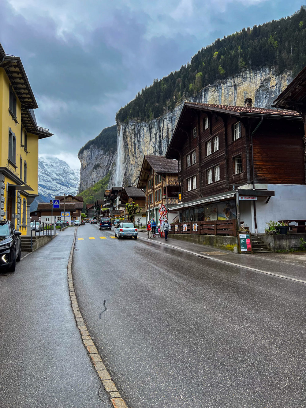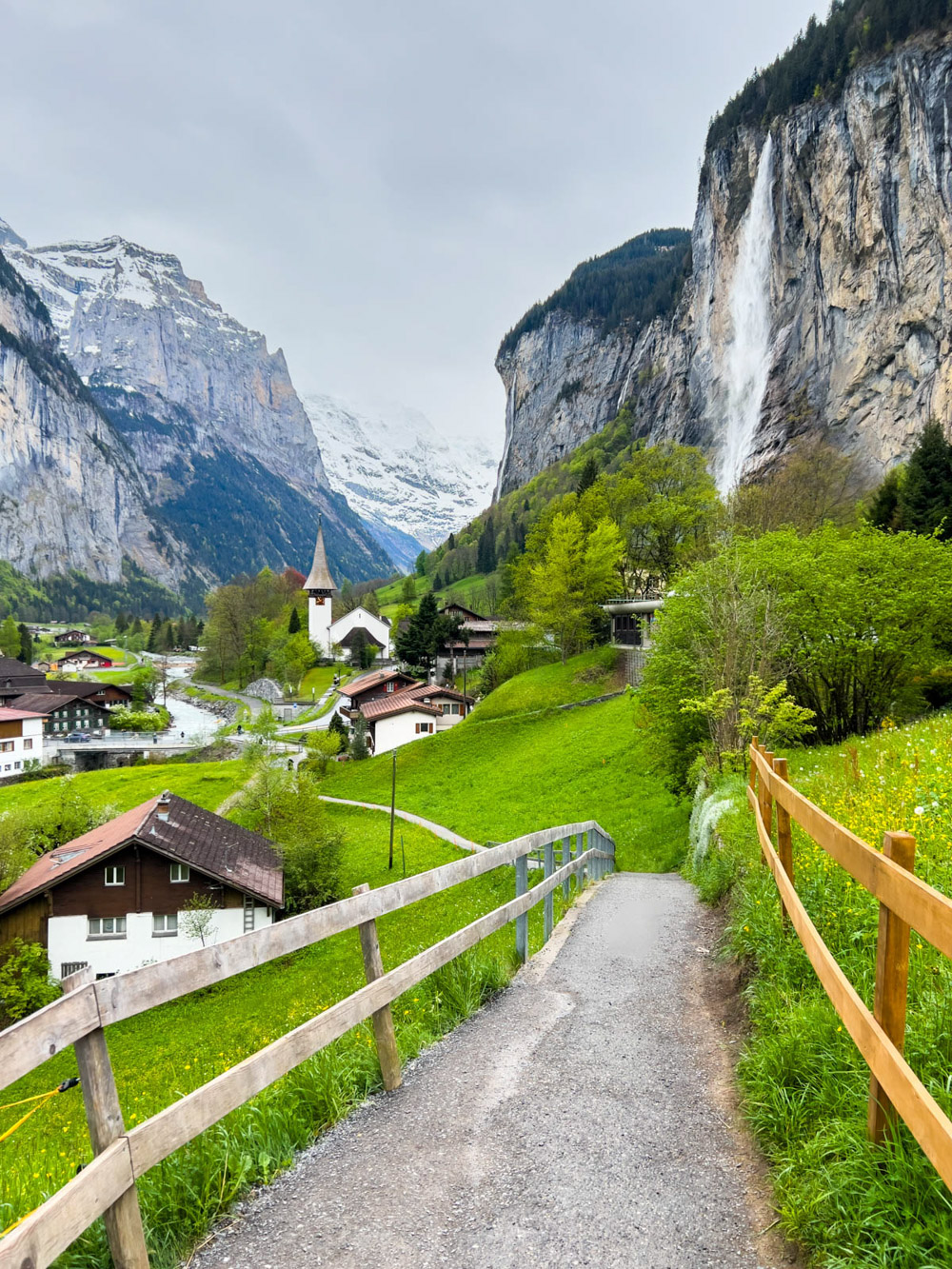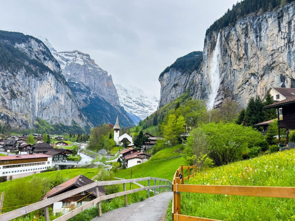 Amanece el día muy nublado y con amenaza de lluvia. Pero bueno, lo aprovechamos igual y nos vamos al precioso pueblo de Lauterbrunnen, un lugar suizo encantador con su famosa cascada y las montañas de fondo. La verdad es que es un sitio muy pintoresco, aunque también bastante masificado, como suele pasar con estos lugares tan bonitos de Suiza. Paseamos por el pueblo, caminamos y disfrutamos de las vistas.