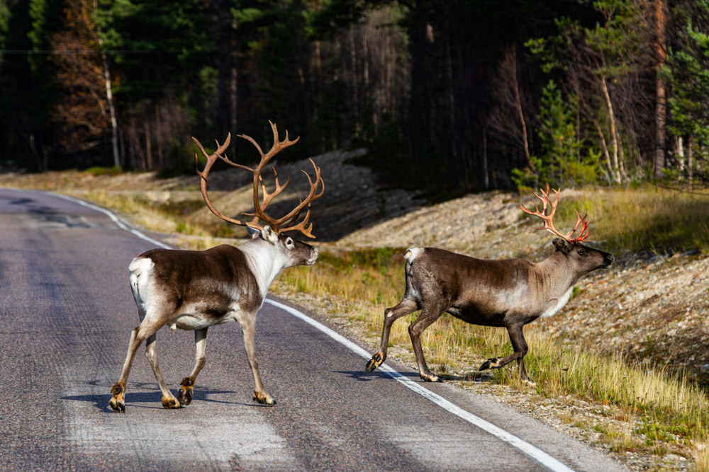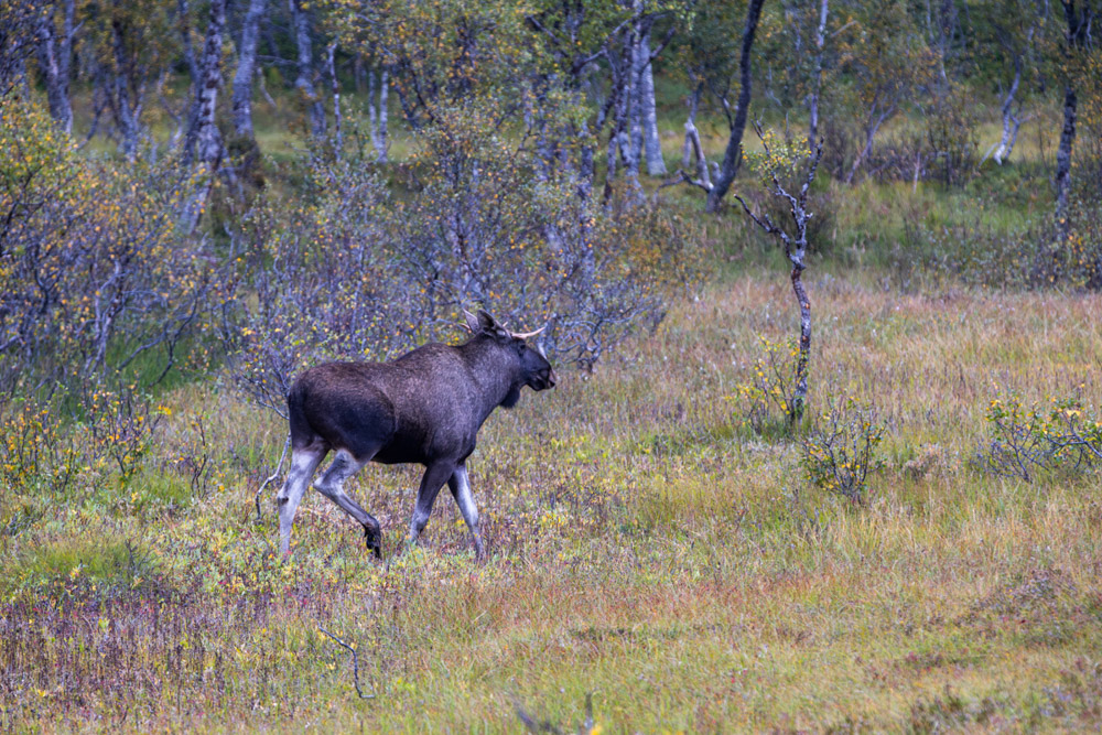 Mientras nos acercamos a Andenes, algo se mueve en un prado. ¡Son alces! Me detengo en un lugar seguro y doy la vuelta con la esperanza de que sigan ahí. ¡Sí, ahí están! Consigo retratar a cinco preciosos ejemplares en fotos y vídeos.