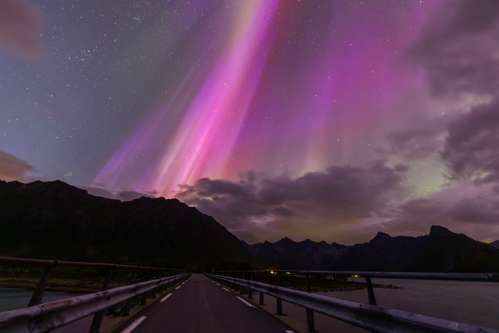 ¡Qué auroras! Esta vez, con un intenso color rosa y mucho movimiento en el cielo. Las disfrutamos en total soledad, en un lugar espectacular entre la carretera y el fiordo. El fuerte viento nos lo pone difícil y pone a prueba mi trípode.