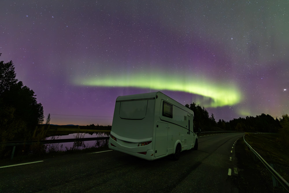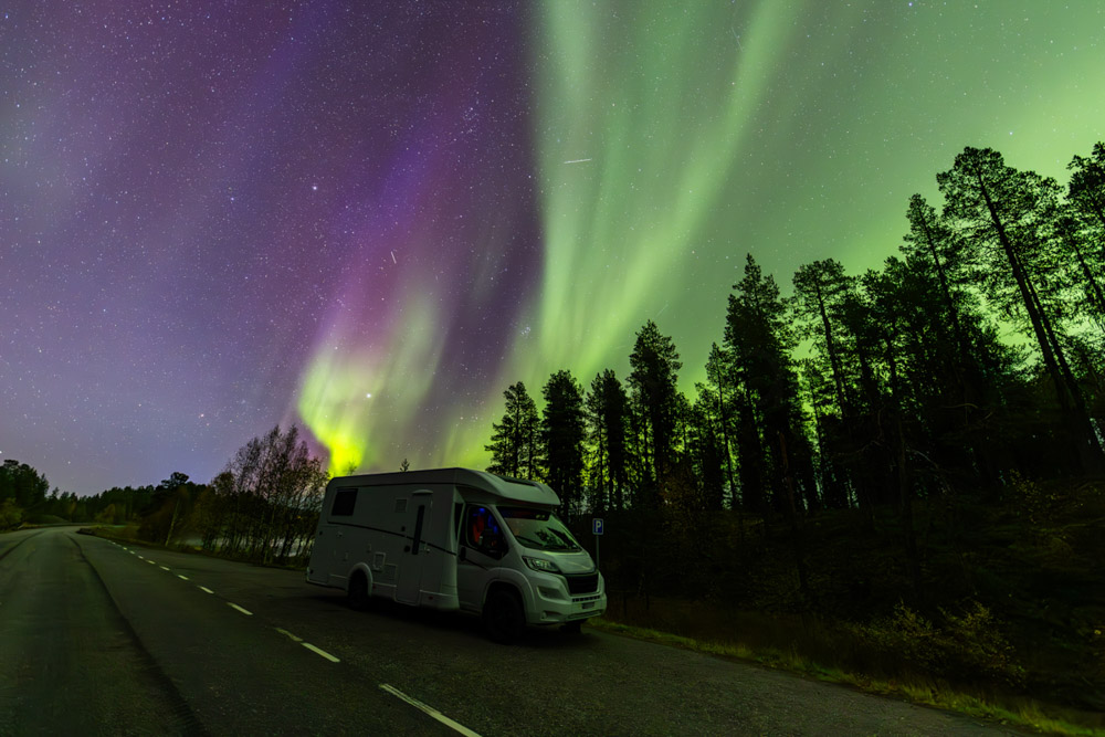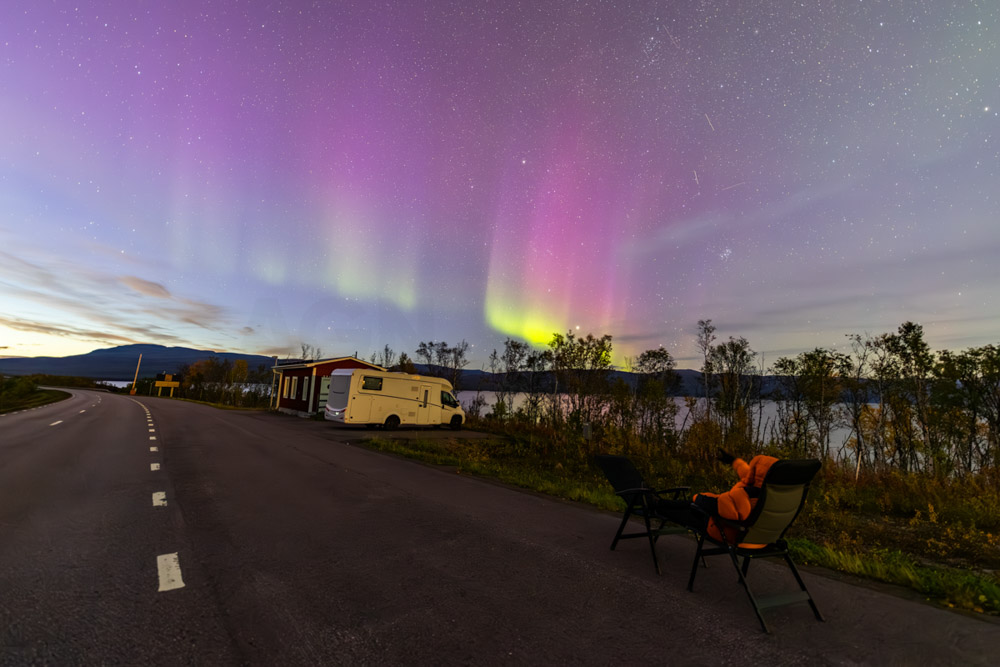 Durante media hora, las auroras se muestran con gran intensidad y dinamismo, hasta que, de repente, el cielo se cubre por completo y empieza a llover. Nos refugiamos en la autocaravana y, tras revisar el radar de lluvia, veo que seguirá lloviendo toda la noche.