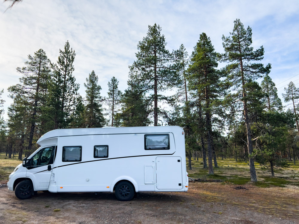 Finalmente, encontramos un sitio donde no se nos va a poner nadie cerca y con vistas al lago. El único inconveniente es que está pegado a la carretera principal y hay bastante tráfico (para ser Laponia, claro).
