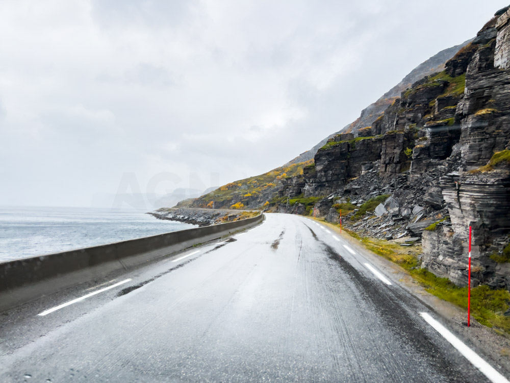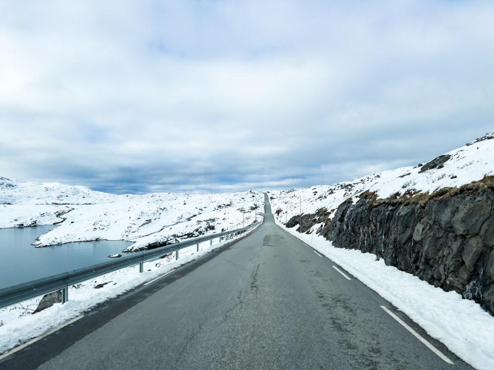 Seguimos nuestra ruta hacia el norte, en dirección a las islas Lofoten. Por el camino, debemos cruzar varios puentes, y con el viento cruzado, la conducción se vuelve difícil. Hay que reducir la velocidad para mantener el control.