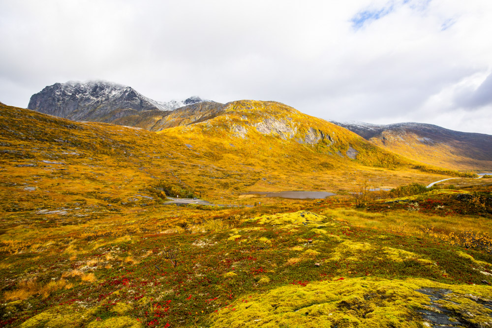 Sigo la ruta hacia el sur y, al revisar las previsiones meteorológicas, veo que anuncian sol en el Parque Nacional de Dovrefjell. Voy directo hacia allí y llego al mediodía. Me sorprende ver las montañas nevadas tan al sur.