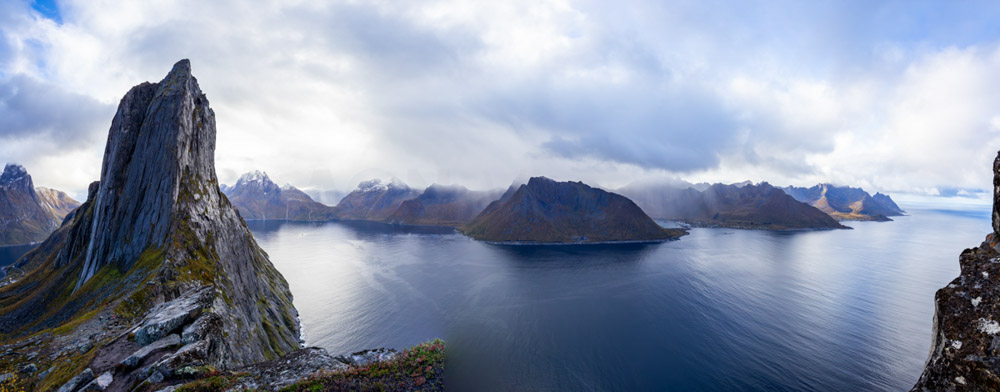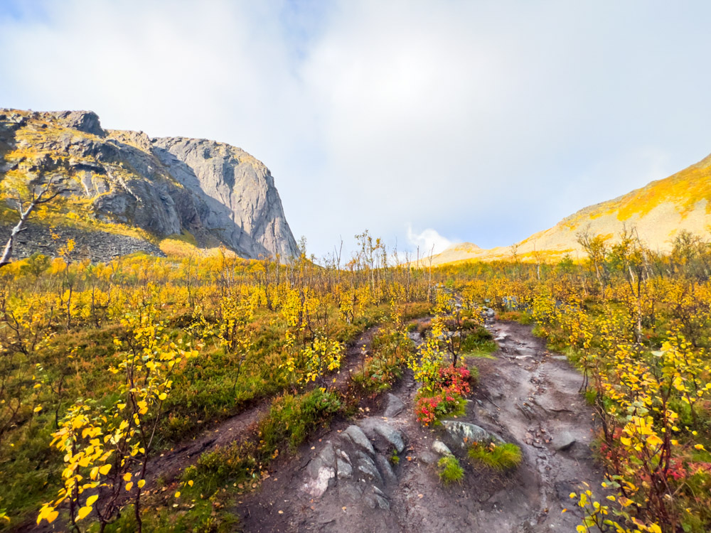 Desayuno y espero a que la lluvia se detenga un poco. Luego me pongo en marcha y comienzo la subida. El camino no es especialmente complicado, el único problema es el barro. Si no se está acostumbrado a la montaña, es mejor no subir hasta la cima del mirador y quedarse en el puerto, que también ofrece unas vistas impresionantes de la montaña Segla y el fiordo.