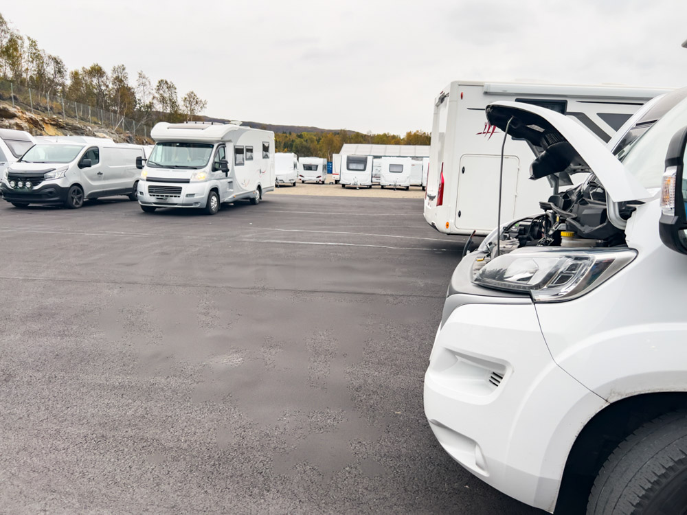 Paso la noche cerca del aeropuerto de Evenes. Justo al lado hay un concesionario de la misma compañía de alquiler de Oslo, donde alquilé la autocaravana. Se encendió la luz de bajo nivel de aceite, así que voy para que la revisen.