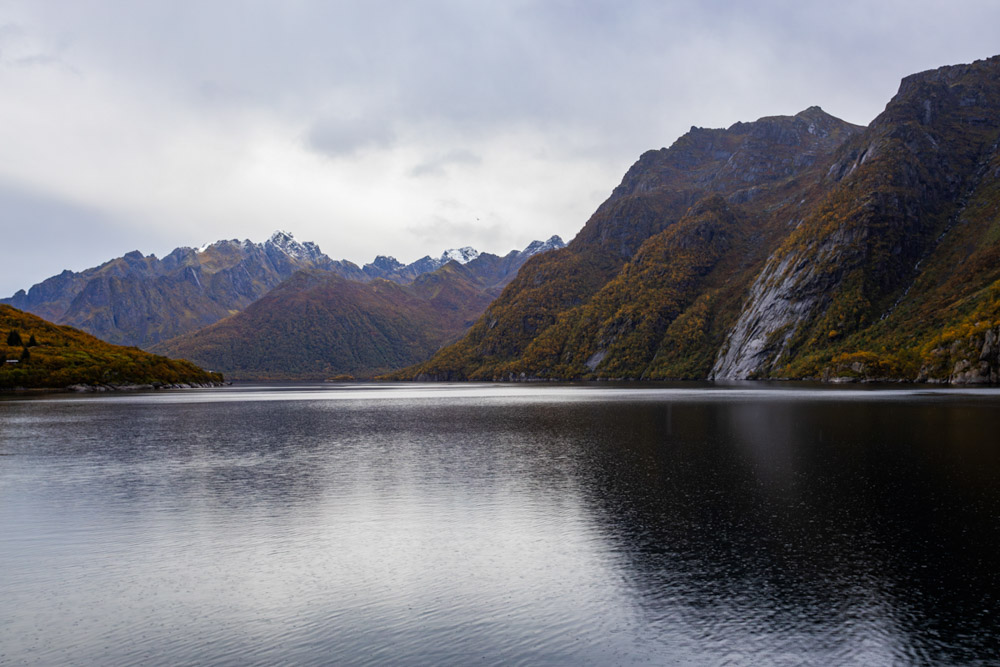 Llegamos a la zona de Lofoten y Vesterålen. Empezaremos explorando el norte, dirigiéndonos primero hacia Vesterålen. El paisaje es espectacular: los colores otoñales visten los fiordos y las montañas, creando una estampa increíble.