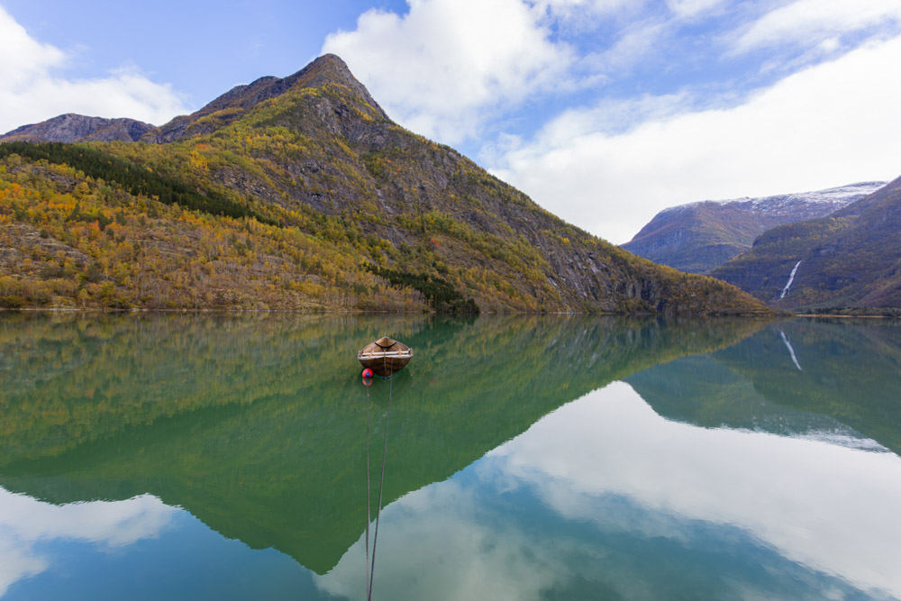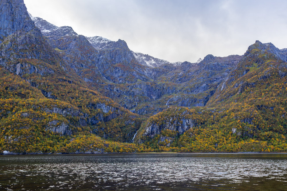 Amanece un nuevo día de lluvia y fuertes vientos. Eso sí, el paisaje es espectacular, con las montañas teñidas de los colores del otoño y una ligera capa de nieve en las zonas más altas. Voy recorriendo el paisaje con un color azul claro espectacular en los fiordos y arcoíris apareciendo a menudo.