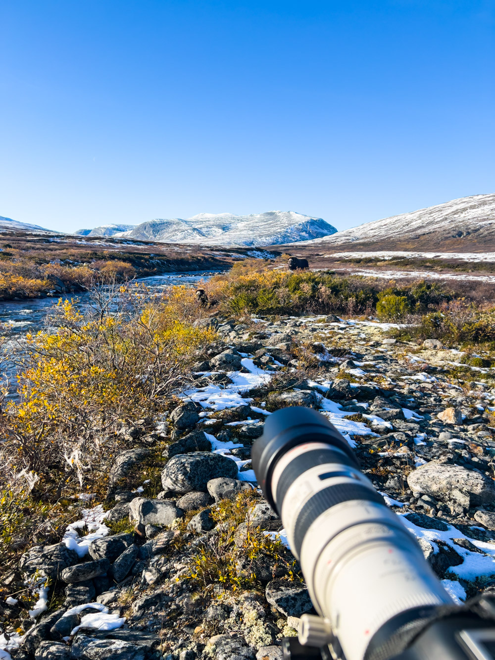 Como rápido, cargo la mochila con el equipo fotográfico y subo rápidamente a la zona del parque donde sé que se encuentran los bueyes almizcleros. Como estuve allí en 2018 durante una travesía con esquís y también en 2023 en un viaje con mi mujer, sé dónde suelen estar.