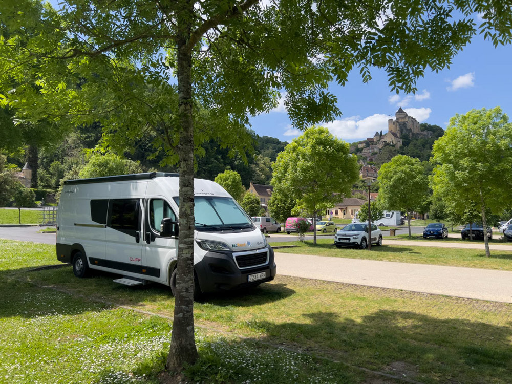 Para pasar la noche, optamos por un camping en lugar del área de autocaravanas, ya que ambos costaban prácticamente lo mismo, pero en el camping teníamos parcela con electricidad, duchas y acceso directo al río. Se trata del Camping de La Plage en Beynac, que está muy bien, aunque bastante apretado: se nota que es una zona muy turística.
