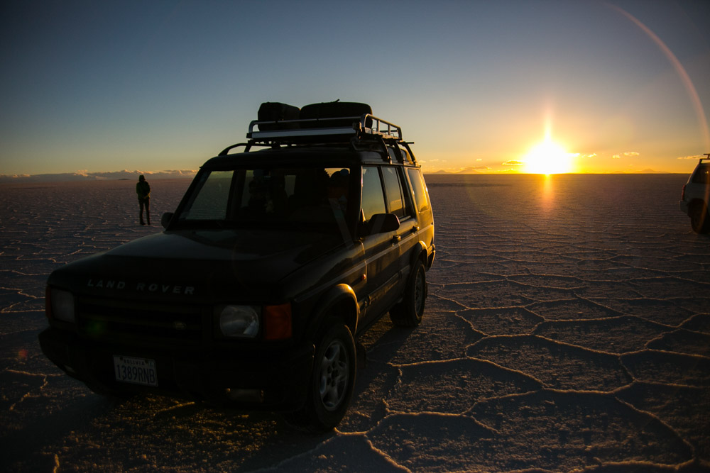 Salimos de Potosí hacia Uyuni. Por el camino nos vamos encontrando grandes paisajes geológicos y antes de llegar a la ciudad de Uyuni, desde la carretera ya se ve el salar y la ciudad. Desde fuera parecía una ciudad fantasma, con mucho polvo a su alrededor. Cruzamos la ciudad y vamos directamente al salar. ¡Qué paisaje tan impresionante! Una gran llanura de desierto de sal. Una puesta de sol espectacular, ¡estaba en medio del salar de Uyuni en los Andes bolivianos!