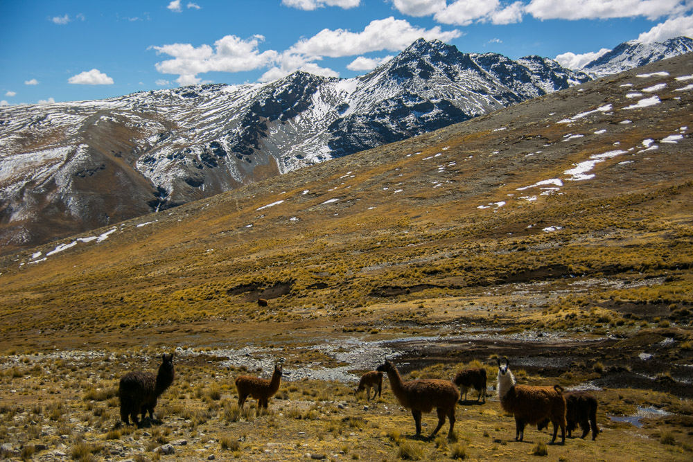 Empezamos el trekking contemplando esas montañas áridas y con las cimas nevadas. Por el camino nos vamos encontrando llamas, vacas y algún toro. Las cuestas costarán debido a la altura, pero se llevan bien. Desde los collados tendremos buenas vistas de los valles, montañas y lagos glaciales.