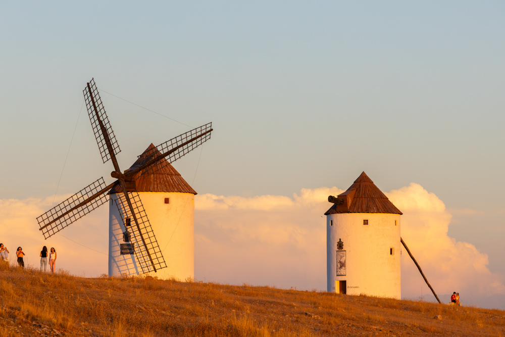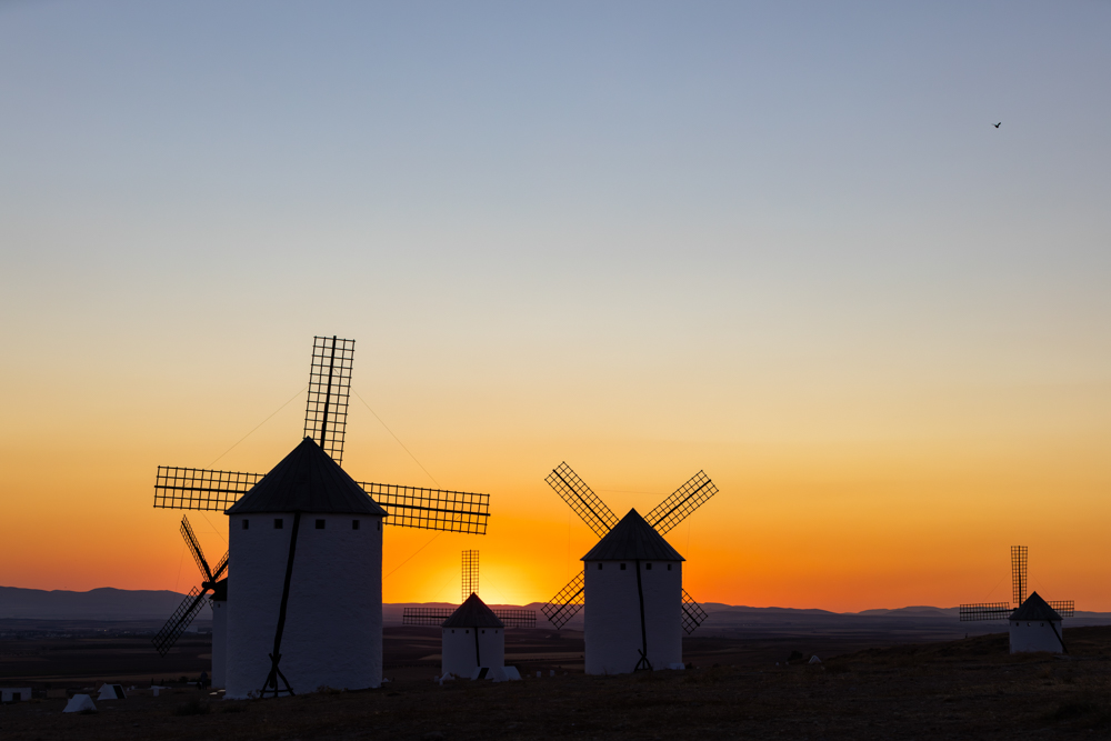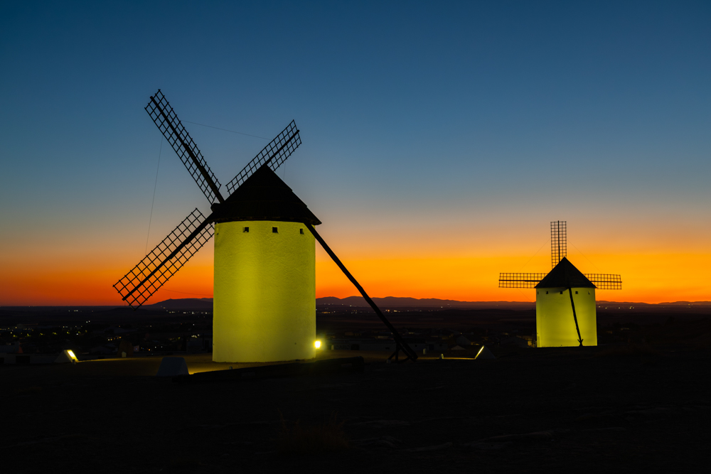 Una vez visitado el castillo, nos dirijimos a Mota del Cuervo. Tengo intencion de hacer la puesta y la salida de sol en este bonito lugar entre molinos y el horizonte eterno manchego. Llegamos y que monton de gente! se nota que es domingo y la gente viene a ver la puesta de sol. La puesta de sol desde este lugar es espectacular, la disfrutamos mucho. ademas, con el crepuscolo, iluminan los molinos, cosa que hace que los molinos aun se resalten mas con el atardecer. Nos vamos a dormir y estaremos solo nosotros y unos alemanes a lo lejos.