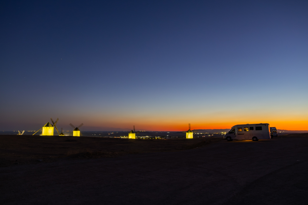 Llegamos a Consuegra y vamos directos a arriba a los Molinos de Consuegra. Tenemos intencion de fotografiar la puesta y salida de sol y lo mejor sera pasar la noche aqui arriba. Hay un parking o area de autocaravanas mas abajo mas resguardada del viento pero nosotros prefereimos pasar aqui arriba la noche. no hay ninguna señal que diga que este prohibido y la guardia civil los vimos un par de veces por la noche y no nos dijeron nada.