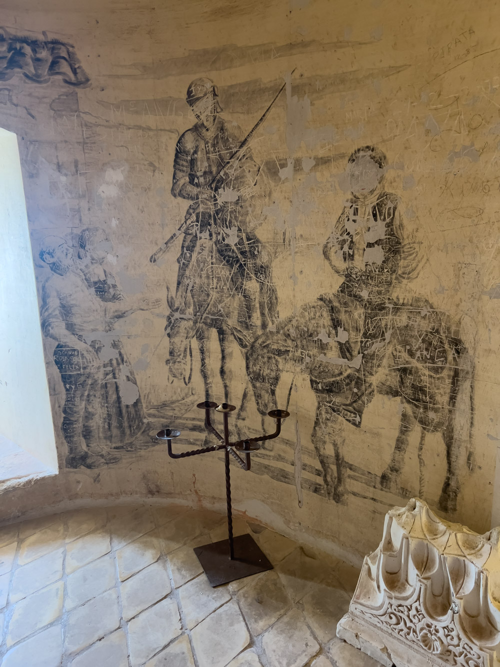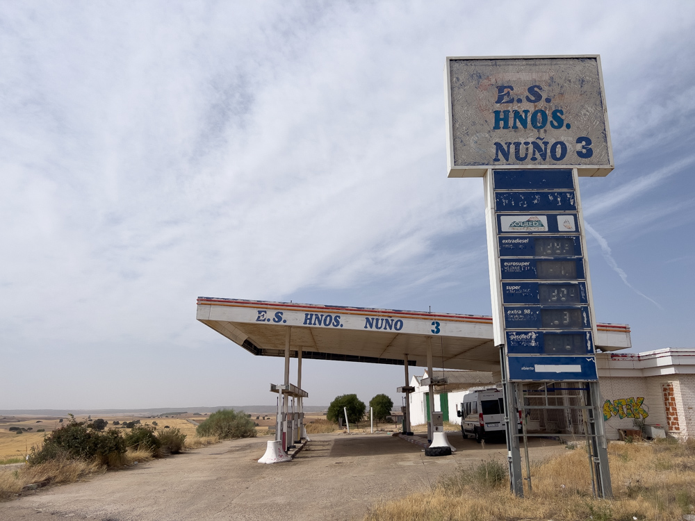 Hacemos una breve parada aprovechando la sombra de una gasolinera abandonada para darle el biberon al niño y continuamos hacia el castillo de Belmonte. Es mediodia asi que estan a punto de cerrar. y aun quedan unas dos horas para que veulvan a abrir. hacemos algunas fotos mientras la gente va saliendo.. Hay que decir que vemos al personal del castillo saliendo y pitando a la gente que iba hacia sus coches, parece que no le gustan mucho los turistas…hay que decir tambien que por la tarde al hacer la visita no vimos que fuesen tan bordes, igual son diferentes los del turno de la mañana y la tarde. Como quedan dos horas y apenas hay sombra, nos vamos a visitar el pueblo el Toboso. Un famoso pueblo manchego con su historia del Quijote.