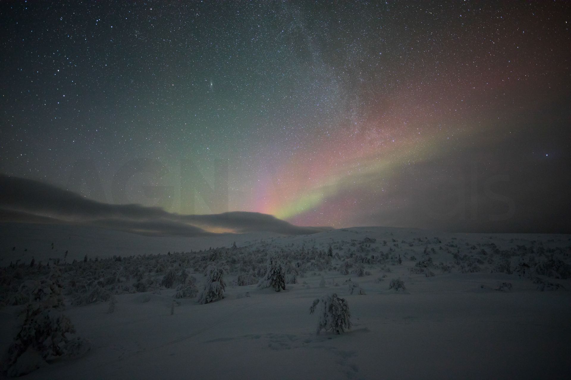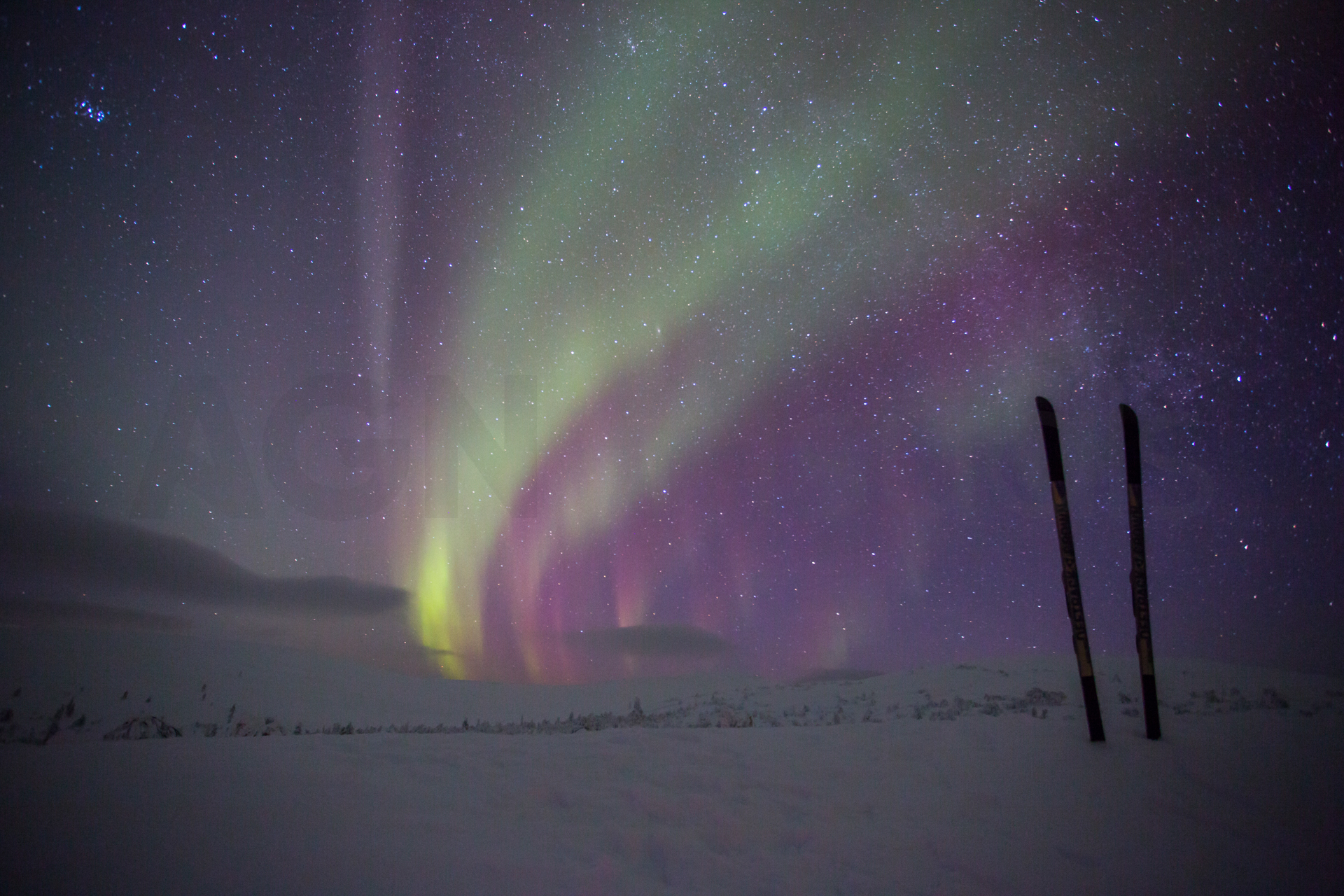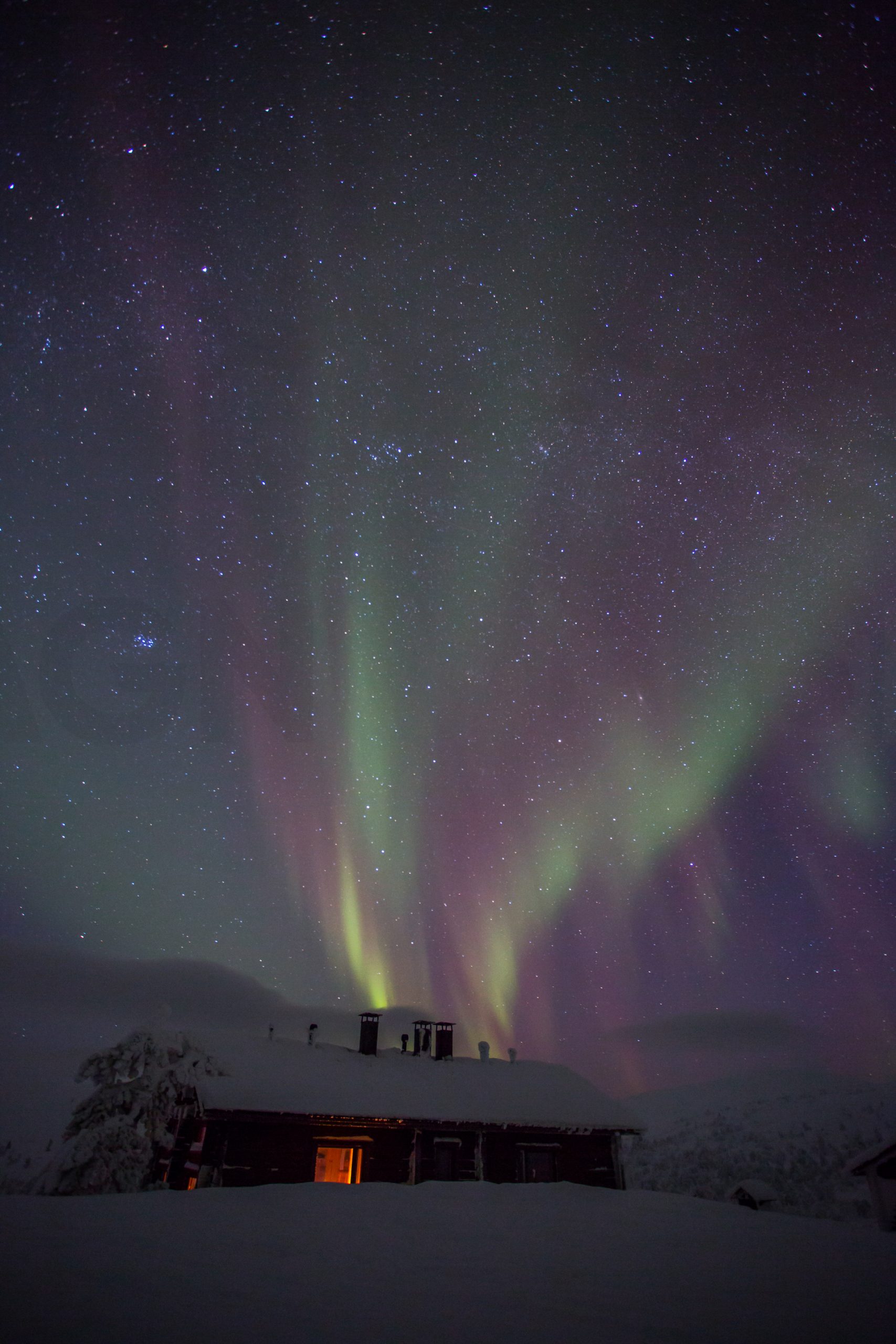 Cae la noche, y estoy todo el rato mirando al cielo, entrando y saliendo de la cabaña. Cuando de repente, veo una pequeña ‘nube’ verde muy difusa. Saco la cámara, tomo una foto y sorpresa, ¡es la aurora boreal! Aviso a la belga y al francés, y todos emocionados tomando fotos.