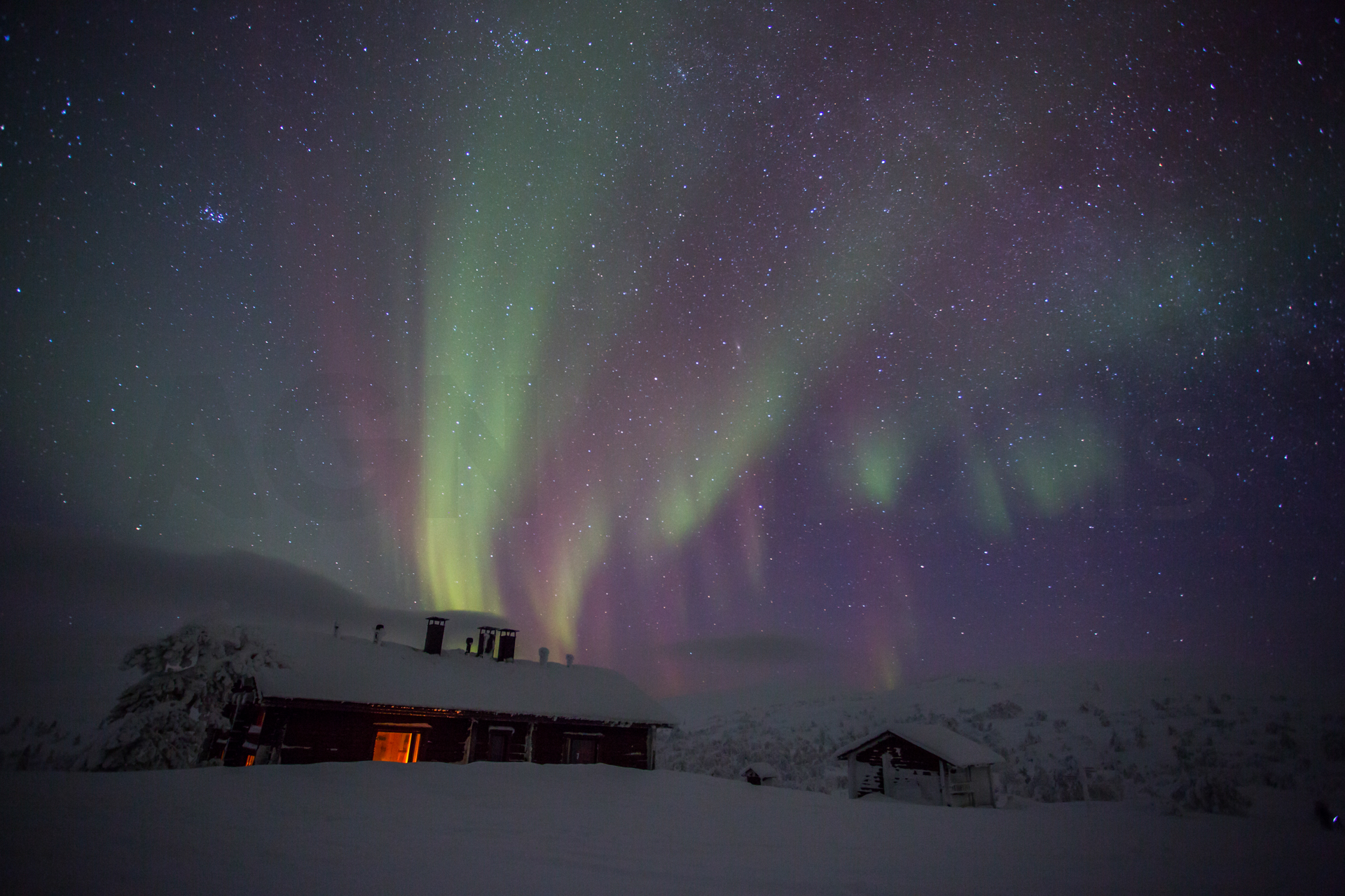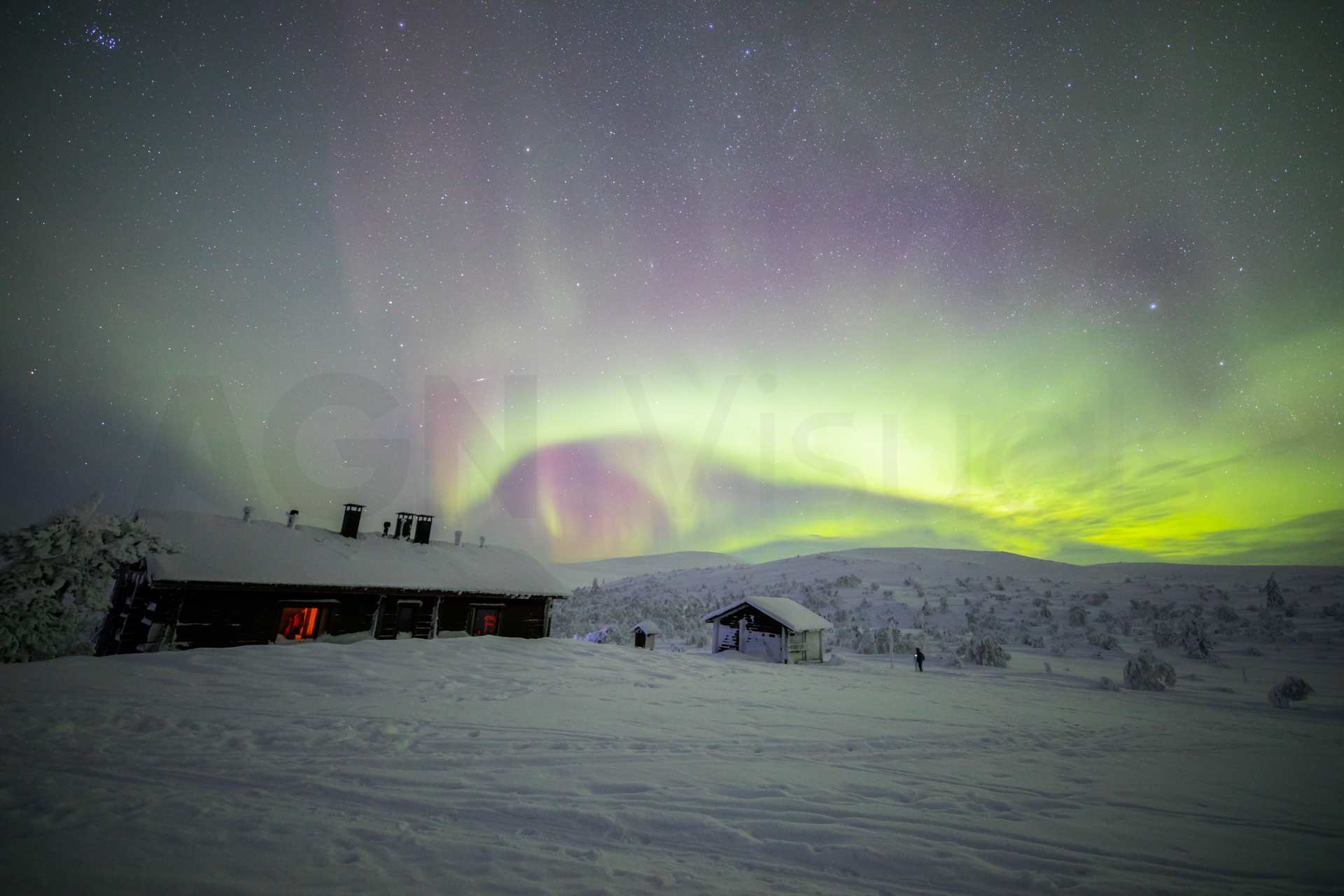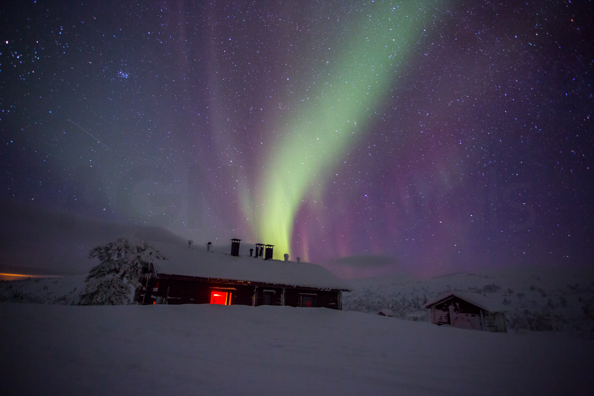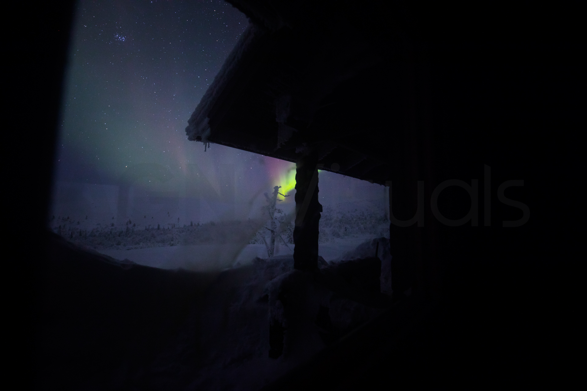 Llego a la cabaña y es momento de preparar la comida y encender el fuego. La cabaña está situada junto a un lago helado y ofrece buenas vistas al norte; con suerte, podré fotografiar de nuevo las auroras. Aquí coincidiré de nuevo con el chico francés. Estoy tan cansado que dejo la cámara haciendo un video timelapse y me voy a dormir. Al día siguiente, mi sorpresa fue que hubo una noche con auroras, no tan impresionantes como las anteriores, pero bonitas.