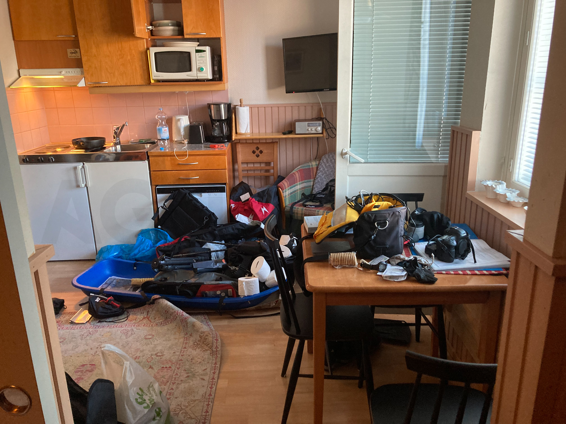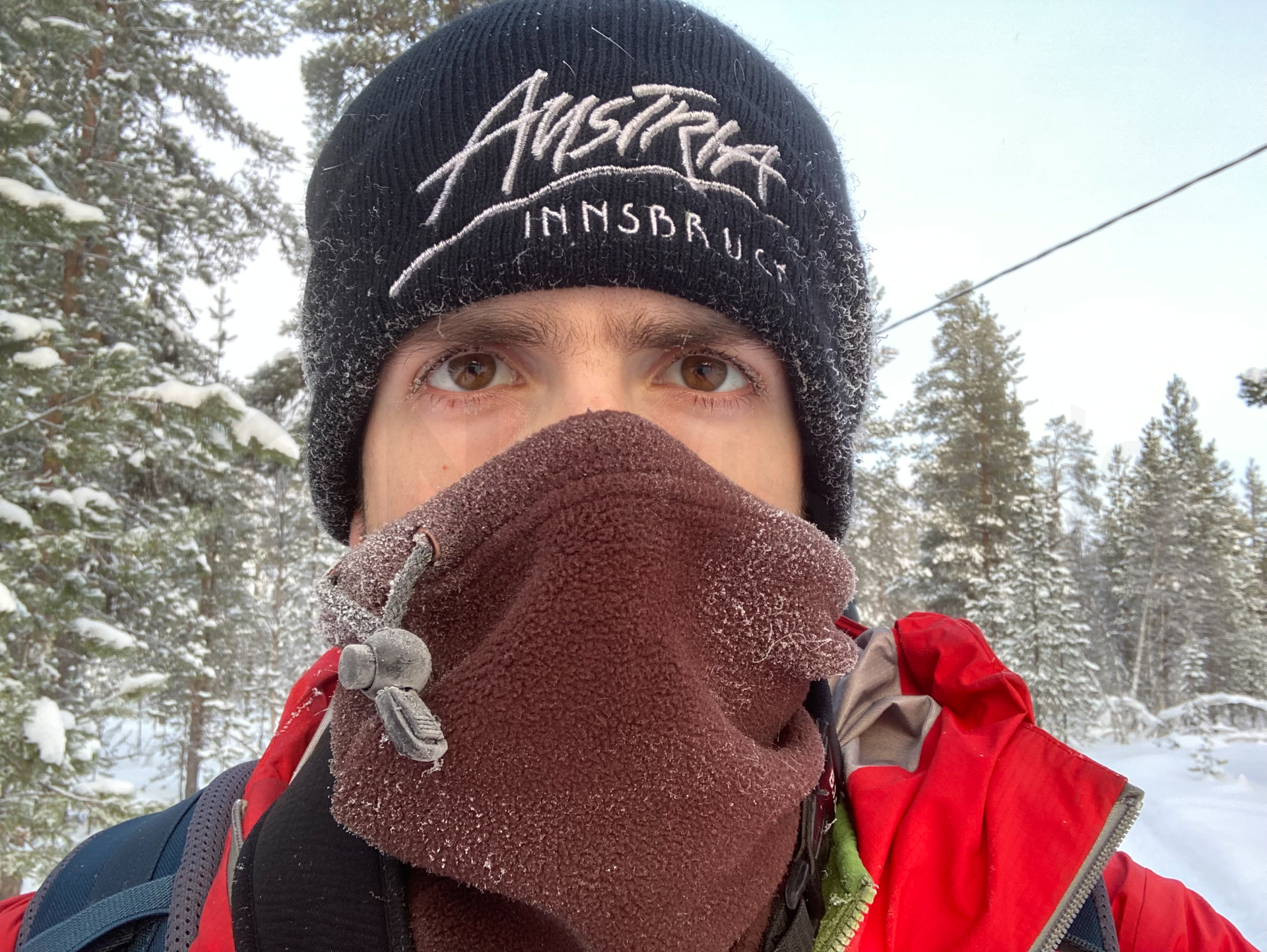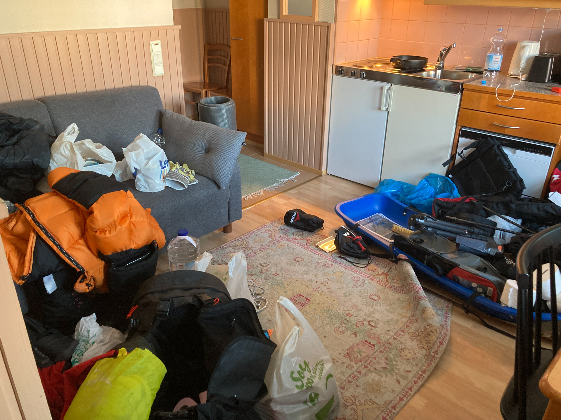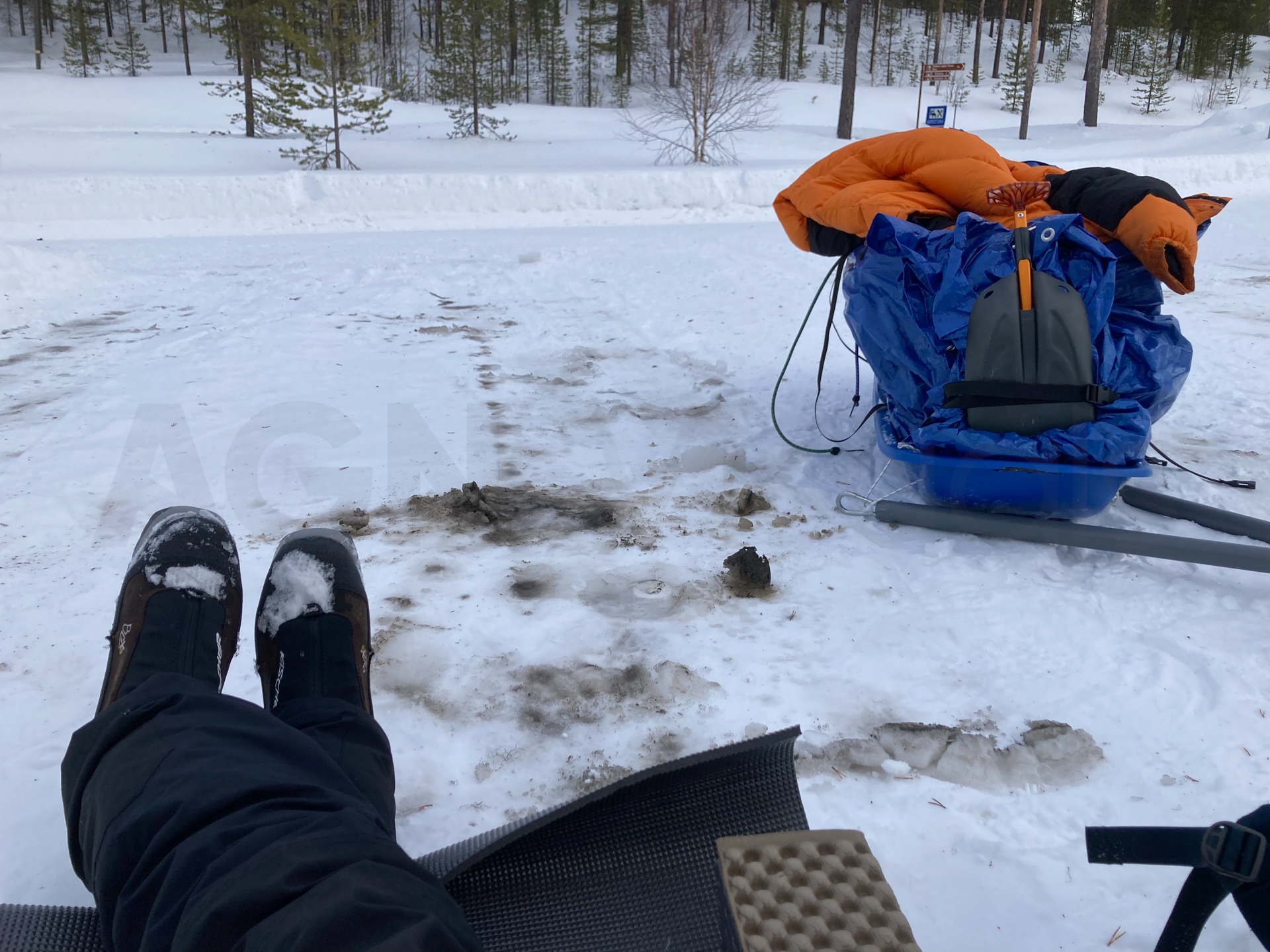 Llego a Kittilä (norte de Finlandia) en medio de una nevada, y al salir del aeropuerto pensaba que me encontraría con muchos controles por el Covid-19. Mi sorpresa fue que, después de recoger las maletas, salí de la zona de recogida de equipaje y me encontré con un pasillo de taxistas sin mascarilla. Me sorprendió después de leer las condiciones tan estrictas para entrar al país. Paso la noche en un apartamento en Levi para poder hacer la compra de comida y de combustible para el hornillo de la cocina al día siguiente.