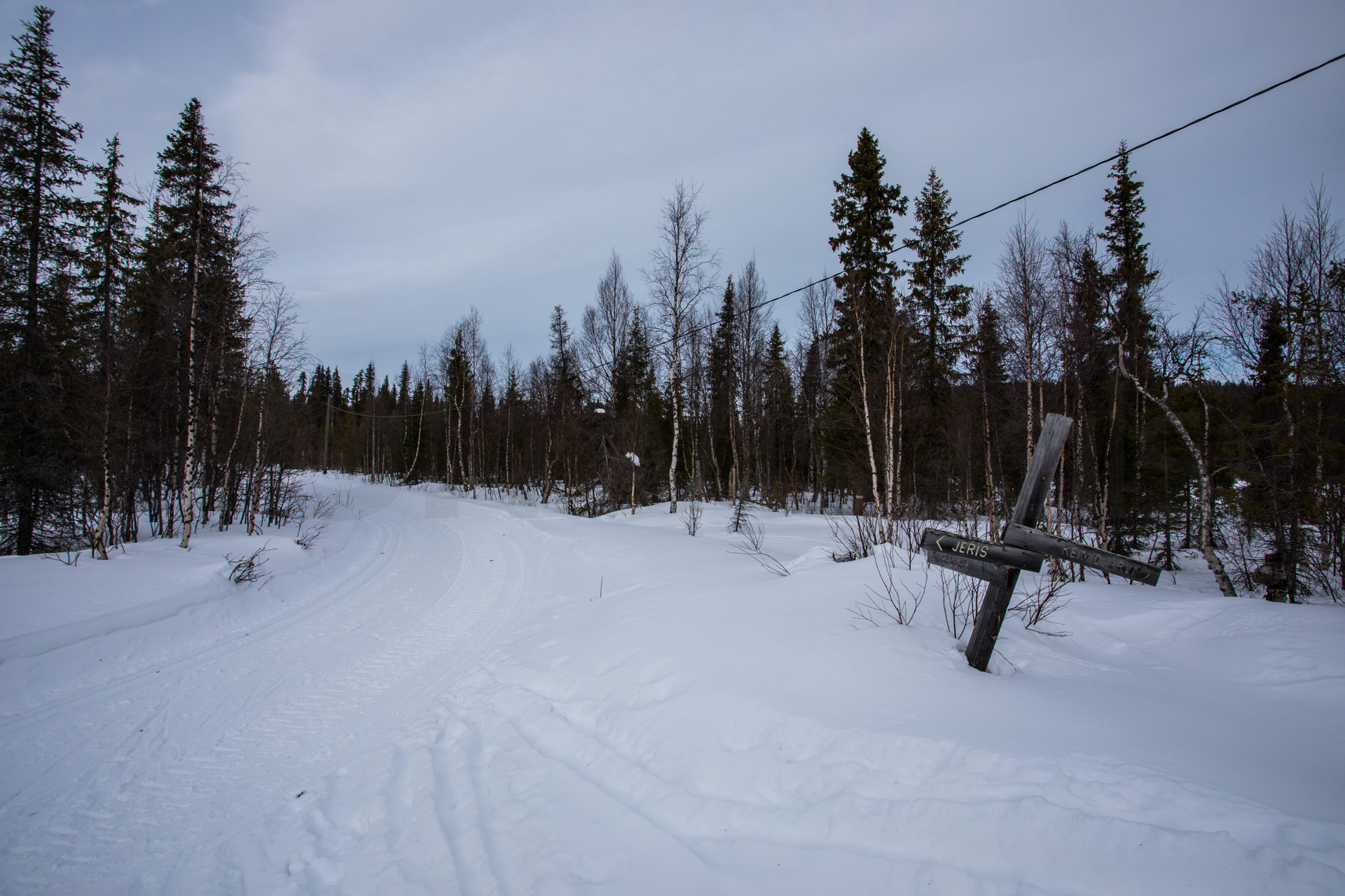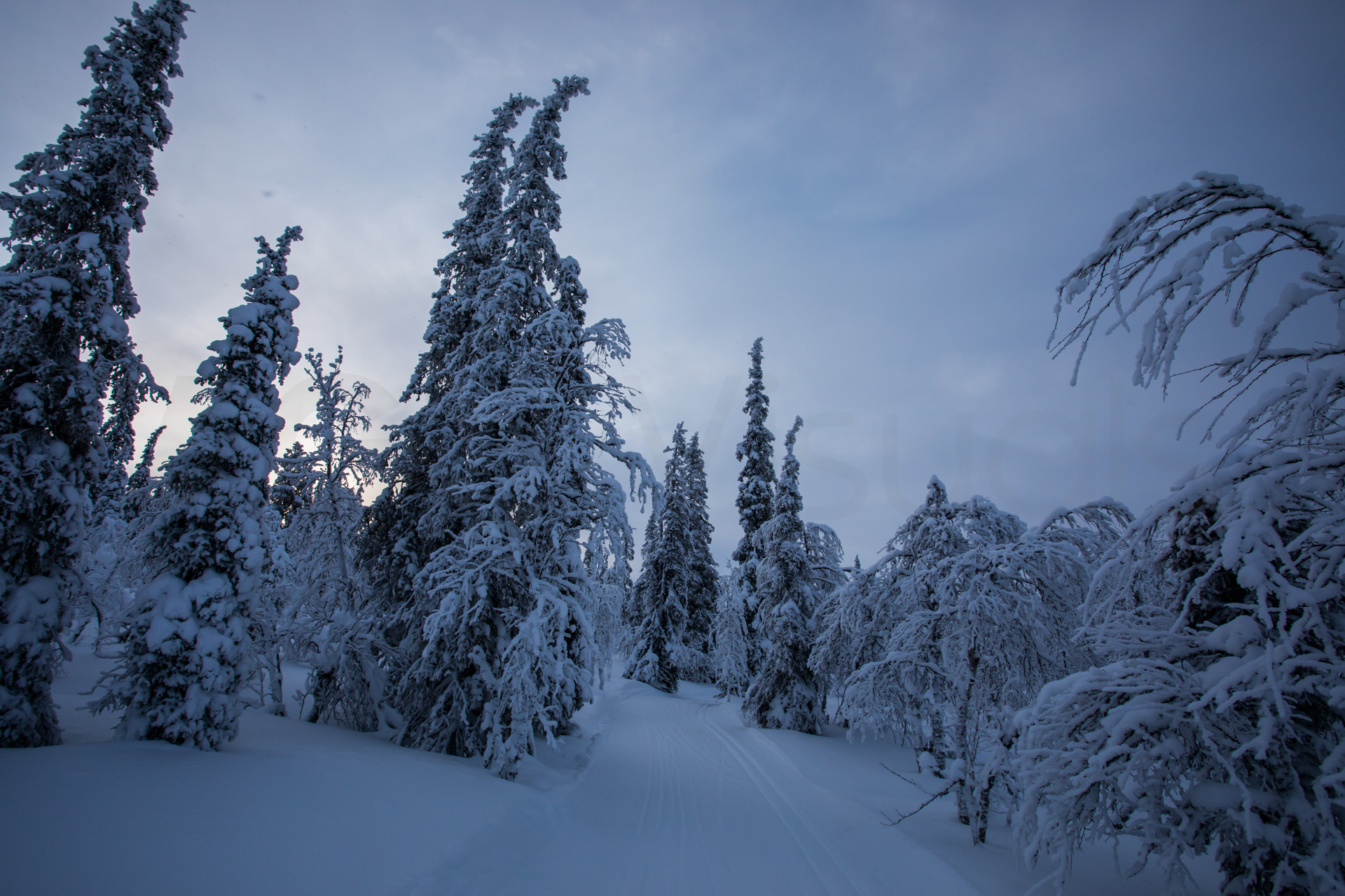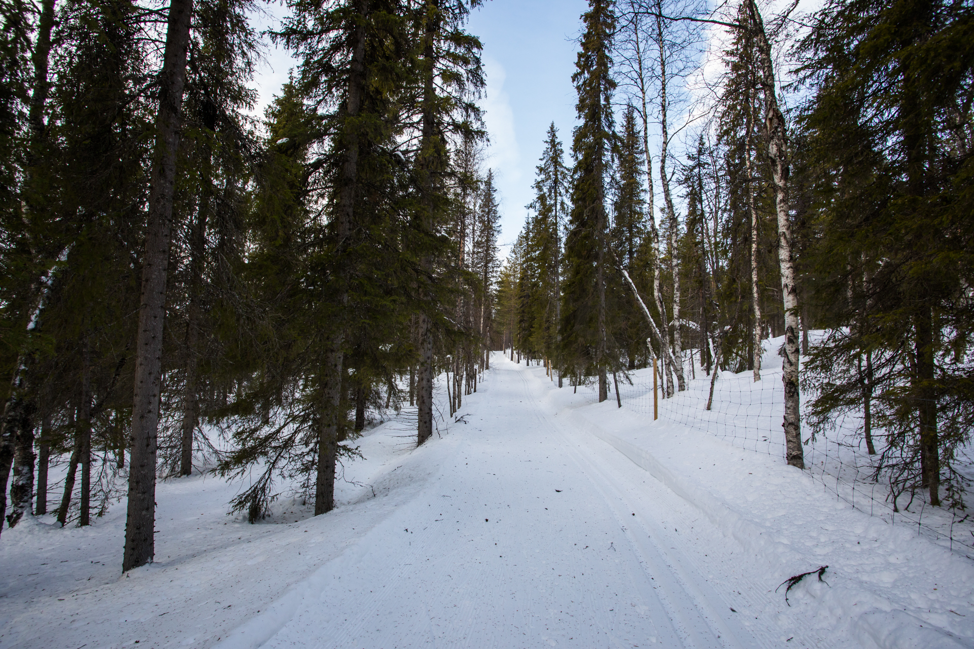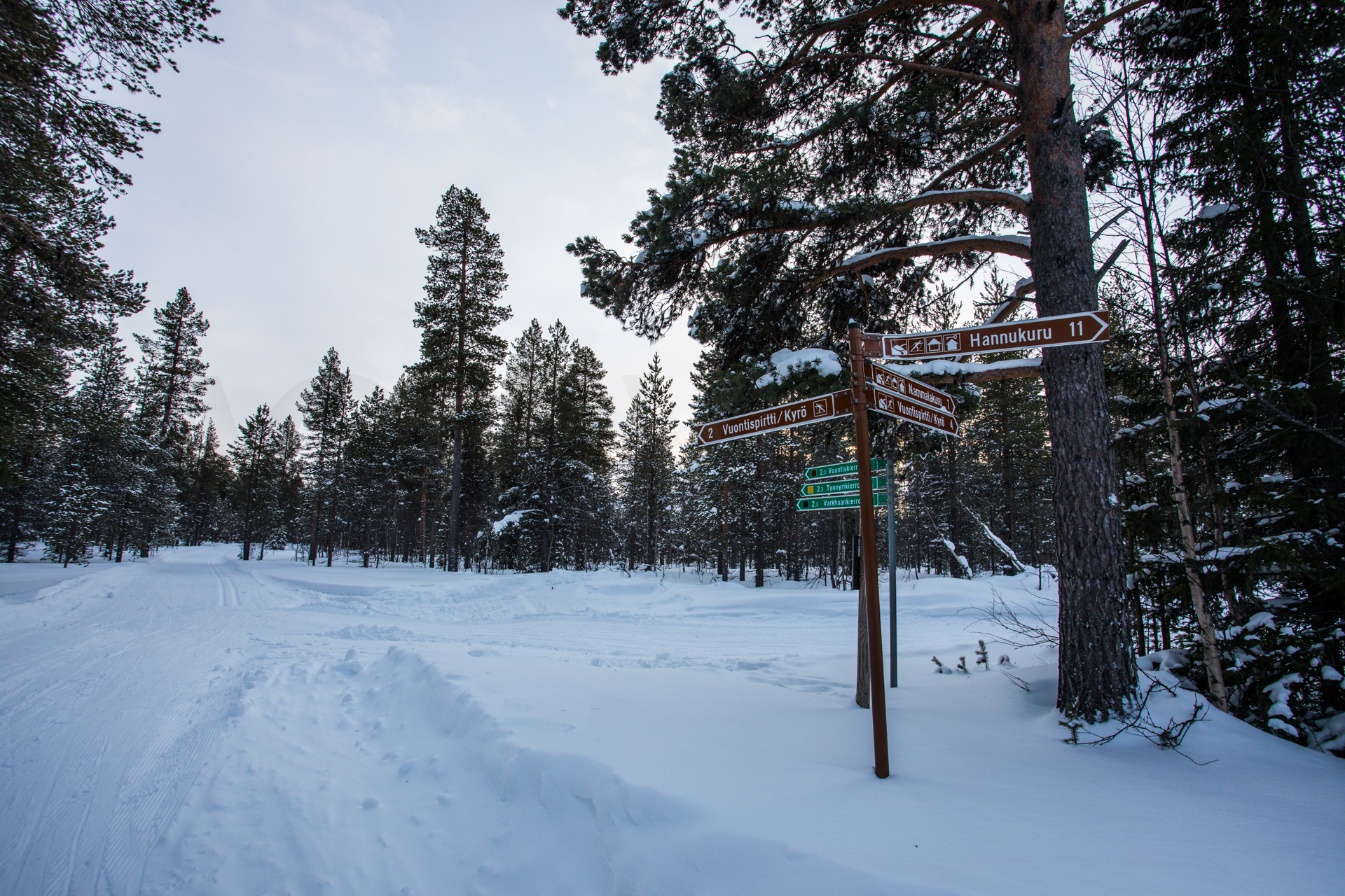 Aquí el trayecto es fácil, con árboles altos y cubiertos de nieve que crean un paisaje espectacular. Sin embargo, la bajada es muy pronunciada y tengo que quitarme los esquís porque no puedo frenar. En una de estas bajadas, un mosquetón se suelta y la pulka me arrastra unos metros fuera de la pista (afortunadamente, gracias a mis conocimientos de autodetención en nieve logro frenar). Regreso a la pista y me doy cuenta de que no llegaré al refugio de Nammalakuru, ya que está oscureciendo. Consulto el mapa y descubro que no hay refugio cercano, pero sí un hotel en Vuontispirtti. Decido ir al hotel, no tanto por cansancio, sino para cargar adecuadamente las baterías de las cámaras, ya que las de segunda marca me han fallado.