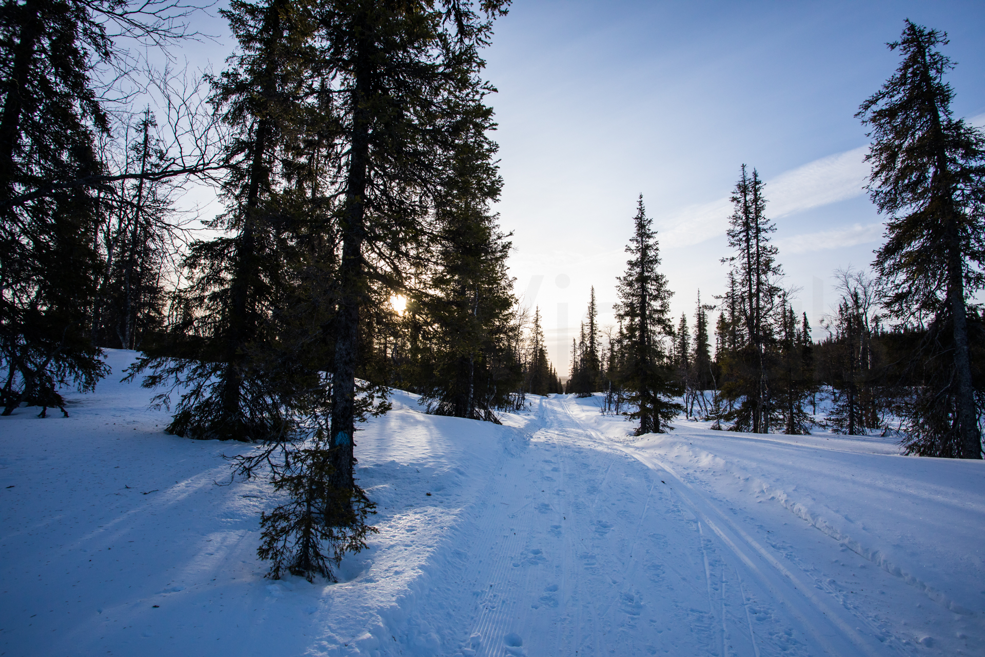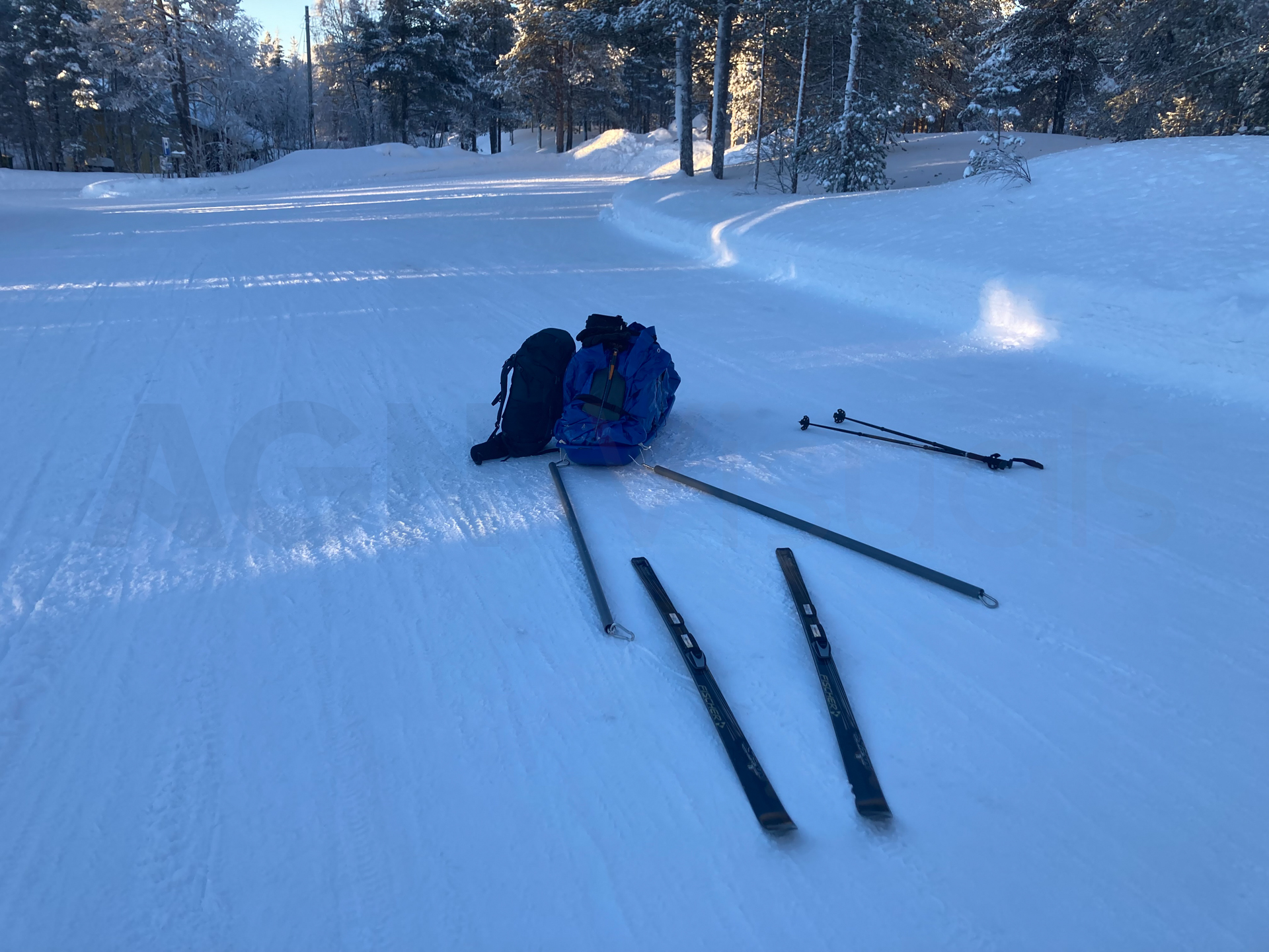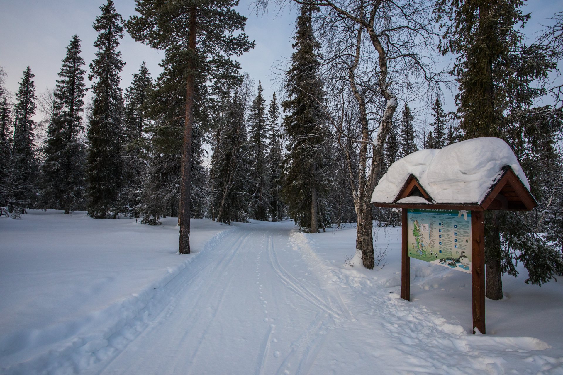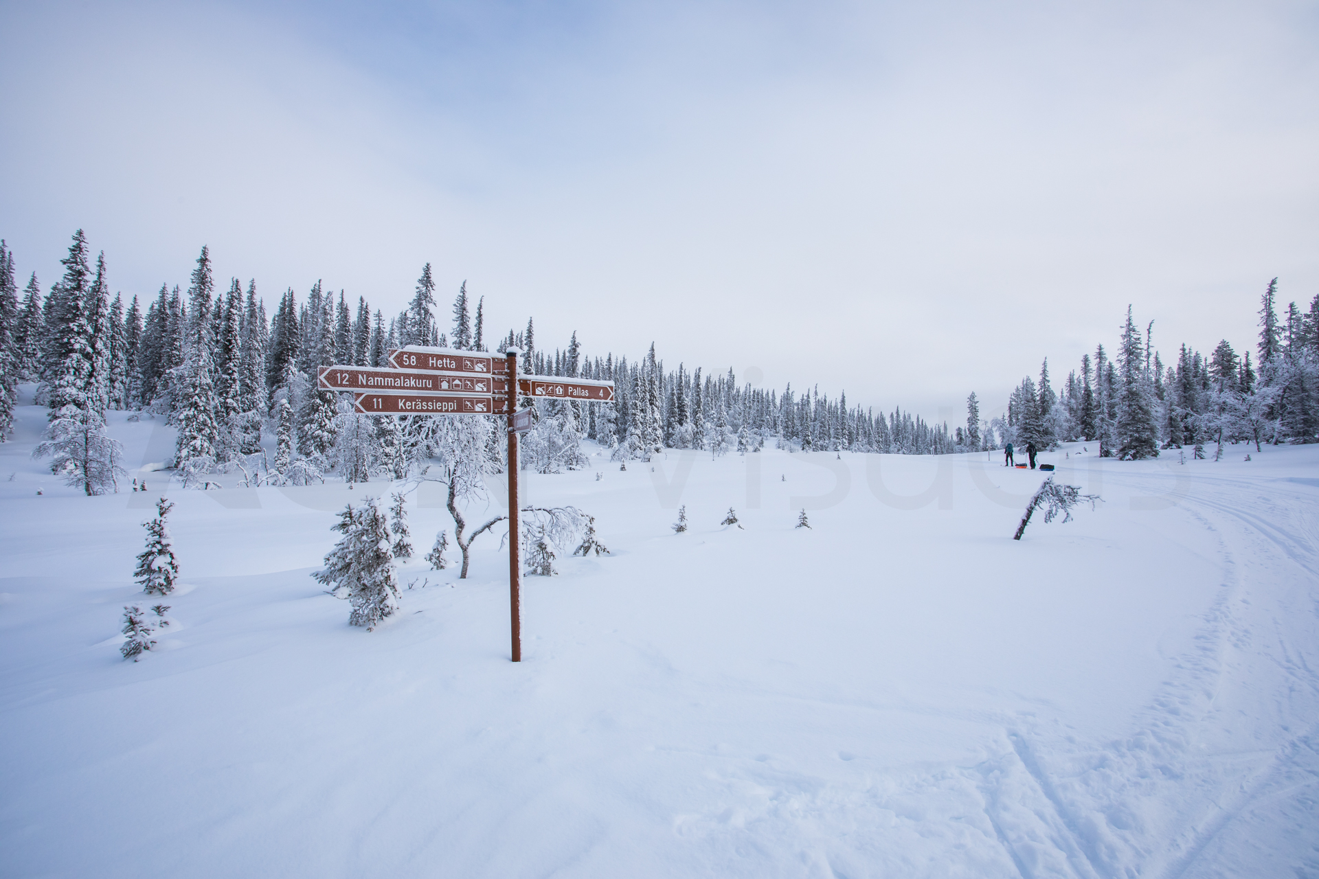 Aquí el trayecto es fácil, con árboles altos y cubiertos de nieve que crean un paisaje espectacular. Sin embargo, la bajada es muy pronunciada y tengo que quitarme los esquís porque no puedo frenar. En una de estas bajadas, un mosquetón se suelta y la pulka me arrastra unos metros fuera de la pista (afortunadamente, gracias a mis conocimientos de autodetención en nieve logro frenar). Regreso a la pista y me doy cuenta de que no llegaré al refugio de Nammalakuru, ya que está oscureciendo. Consulto el mapa y descubro que no hay refugio cercano, pero sí un hotel en Vuontispirtti. Decido ir al hotel, no tanto por cansancio, sino para cargar adecuadamente las baterías de las cámaras, ya que las de segunda marca me han fallado.