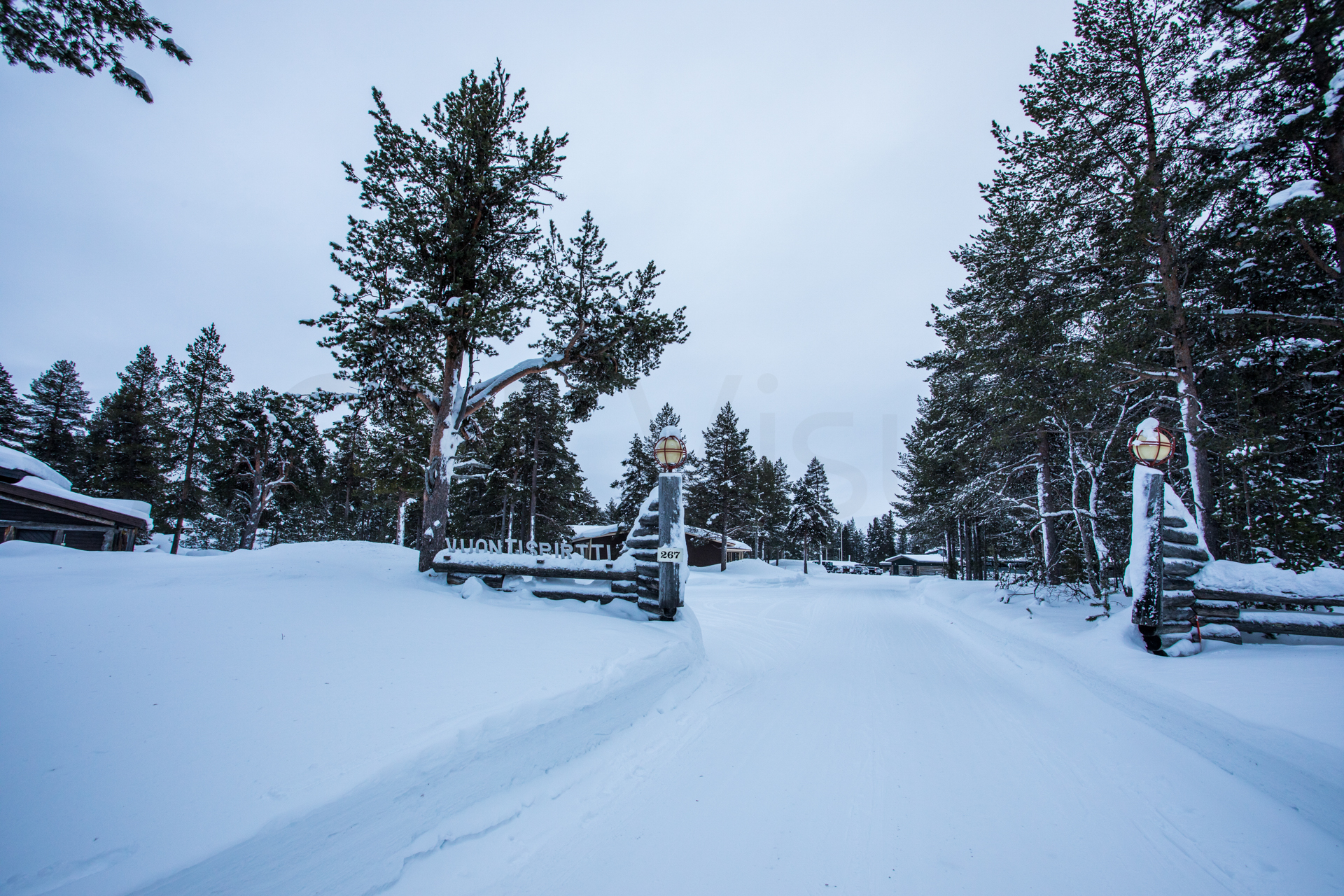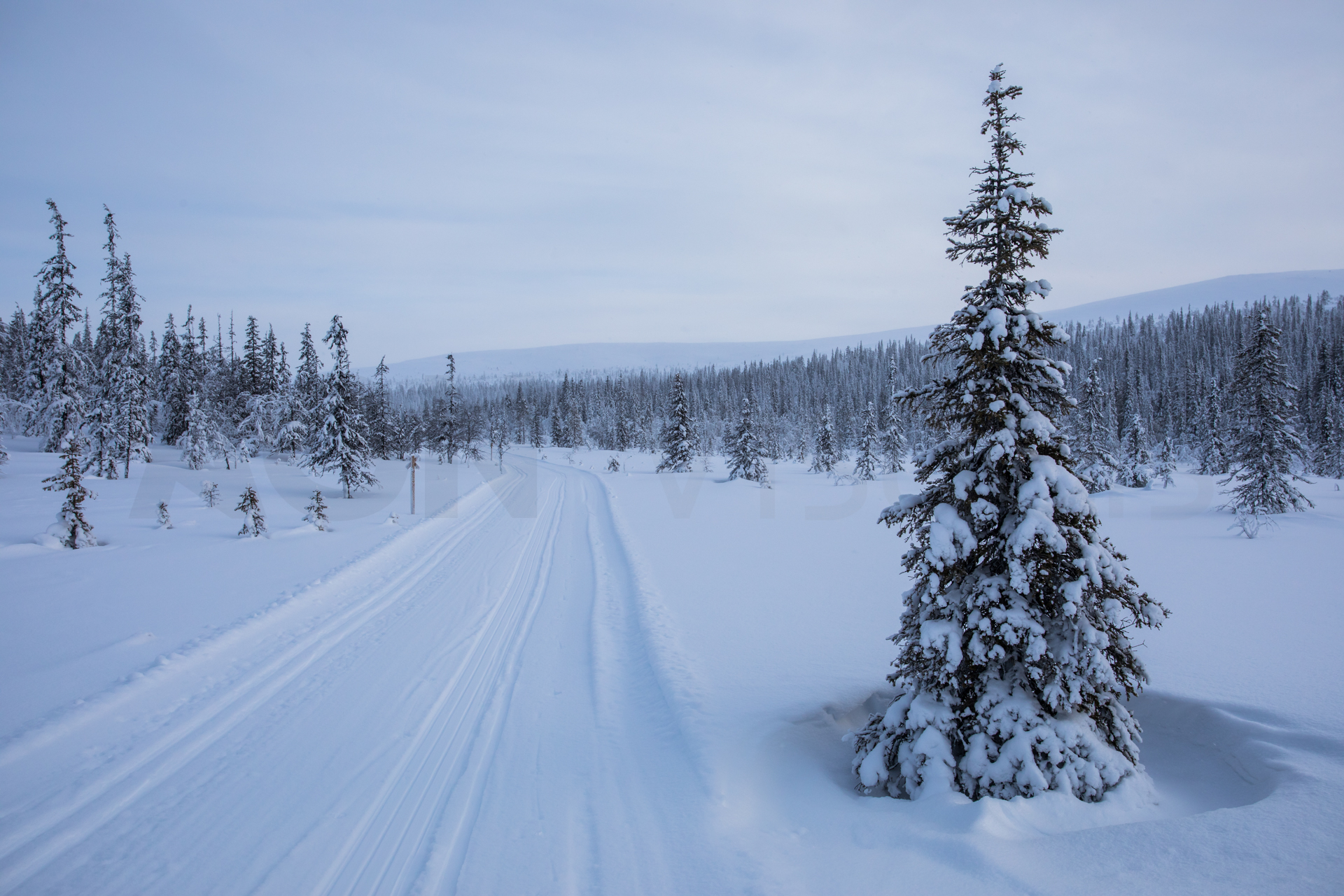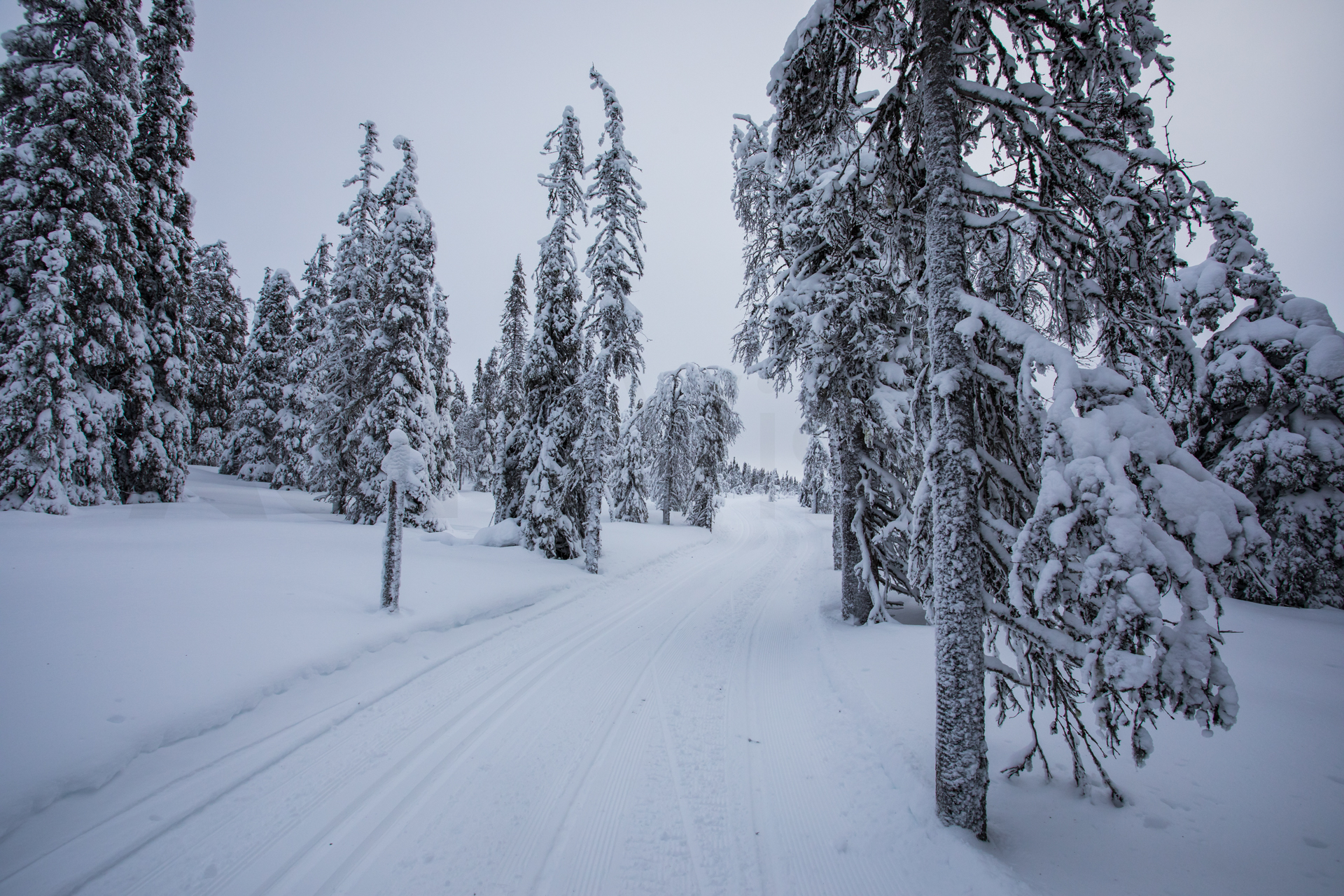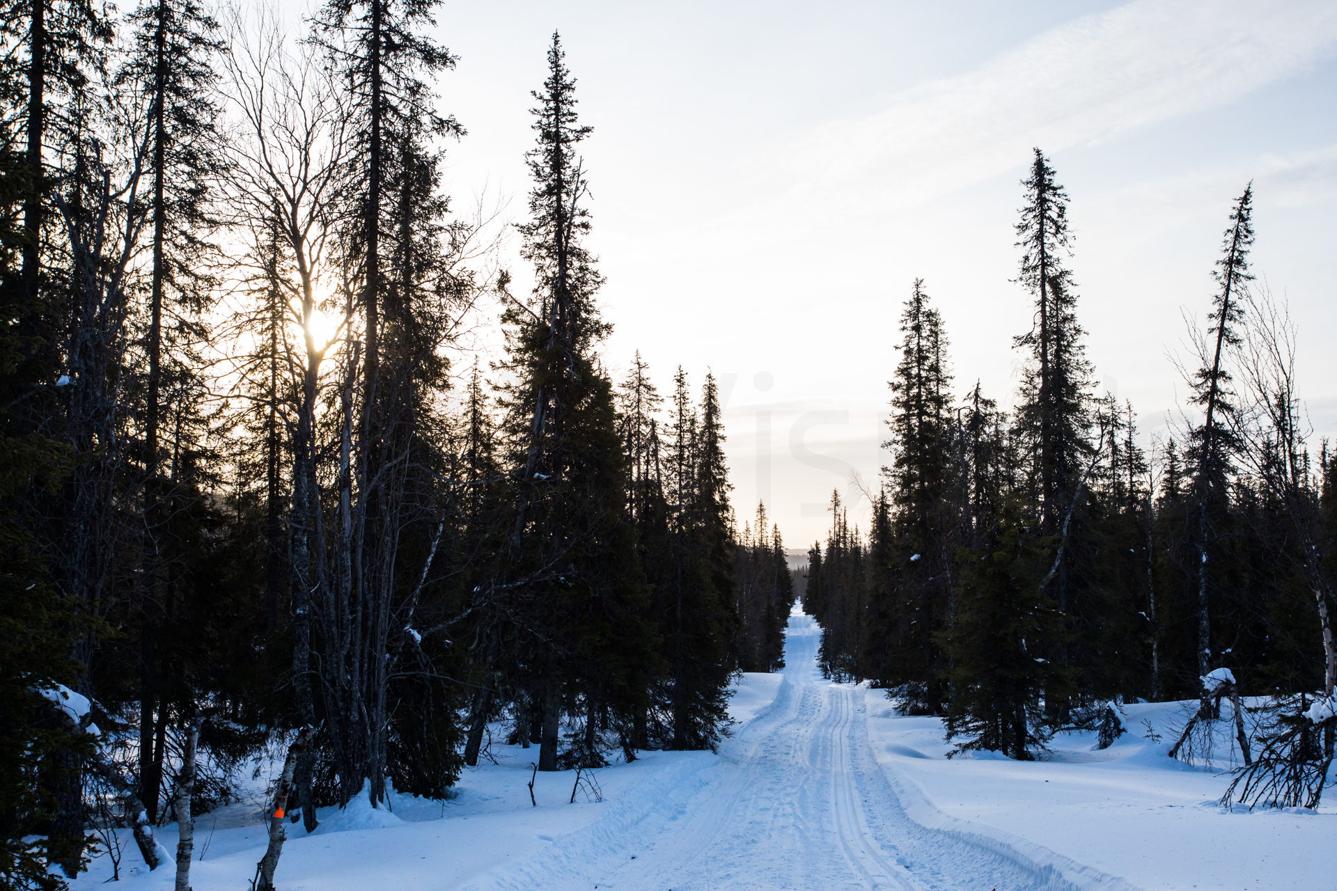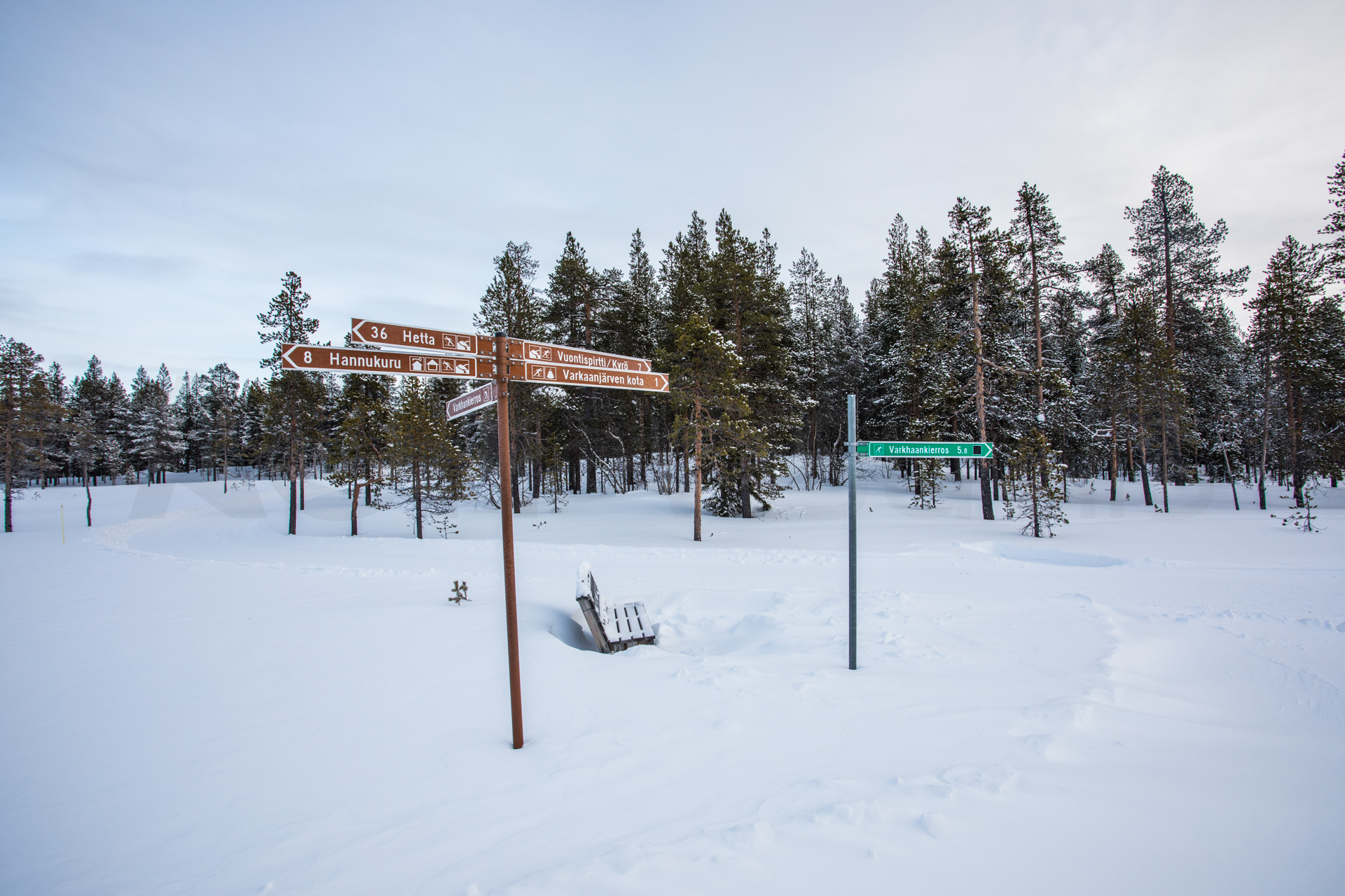 Aquí el trayecto es fácil, con árboles altos y cubiertos de nieve que crean un paisaje espectacular. Sin embargo, la bajada es muy pronunciada y tengo que quitarme los esquís porque no puedo frenar. En una de estas bajadas, un mosquetón se suelta y la pulka me arrastra unos metros fuera de la pista (afortunadamente, gracias a mis conocimientos de autodetención en nieve logro frenar). Regreso a la pista y me doy cuenta de que no llegaré al refugio de Nammalakuru, ya que está oscureciendo. Consulto el mapa y descubro que no hay refugio cercano, pero sí un hotel en Vuontispirtti. Decido ir al hotel, no tanto por cansancio, sino para cargar adecuadamente las baterías de las cámaras, ya que las de segunda marca me han fallado.